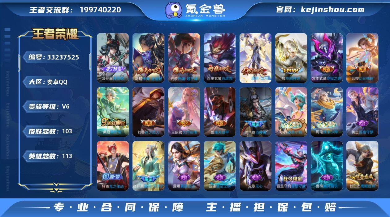 【954677】安卓Q-V6-至尊星耀III段位-113英雄-103皮肤-1无双-11传说-26史诗 【英雄全皮】:孙权全皮,影全皮 【无双皮肤】:公孙离离恨烟 【传说皮肤】:云缨神骥越千峰,马超神骥逐星野,司空震愿照山河定,云缨幻光神枪,桑启鸣野蒿,王昭君乞巧织情,铠绛天战甲,镜炽阳神光,刘备时之恋人,百里玄策白虎志,宫本武藏地狱之眼 【限定皮肤】:公孙离离恨烟,姜子牙天穹之誓,狄仁杰阴阳师,赵云皇家上将,元歌无心,狄仁杰魔术师,达摩沙漠行僧,项羽海滩派对,程咬金演武夺筹,兰陵王金庭之子,李元芳银河之约,百里玄策白虎志,沈梦溪大漠名商,沈梦溪龙舞盛年 【年限皮肤】:百里玄策白虎志,司空震愿照山河定 【赛季限定】:程咬金演武夺筹,达摩沙漠行僧,兰陵王金庭之子,沈梦溪大漠名商,姜子牙天穹之誓,东皇太一噬灭天穹,太乙真人谧流熔炉,钟馗虚灵犬护,甄姬逆浪荇歌,亚瑟荣光之誓 【战令限定】:李元芳银河之约,亚连破空之剑,孙悟空神迹守卫,百里守约百相守梦,老夫子百相守梦,周瑜线条小狗,小乔线条小狗 【史诗皮肤】:明世隐百晓客,周瑜线条小狗,小乔线条小狗,黄忠百相守梦,狂铁龙之律动,赵怀真器灵浮梦炉,弈星万物之道,百里守约百相守梦,亚连...