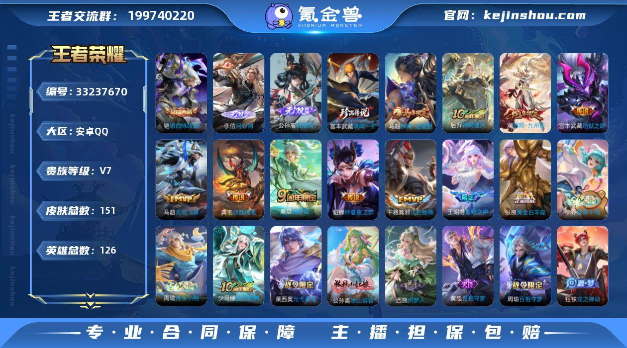 【954670】安卓Q-V7-最强王者段位-126英雄-151皮肤-1典藏皮肤-2无双-1珍品传说-11传说-42史诗 【英雄全皮】:影全皮 【荣耀典藏】:铠银白咏叹调 【无双皮肤】:李信问心剑,公孙离离恨烟 【珍品传说】:宫本武藏黑崎一护 【传说皮肤】:马超神骥逐星野,后羿神树通天,澜愿照九州拓,桑启鸣野蒿,典韦战鼓燎原,王昭君星穹之声,马超无双飞将,张良黄金白羊座,干将莫邪久胜战神,貂蝉仲夏夜之梦,宫本武藏地狱之眼 【限定皮肤】:公孙离离恨烟,狄仁杰阴阳师,赵云皇家上将,狄仁杰魔术师,项羽海滩派对,王昭君星穹之声,裴擒虎李小龙,鲁班大师探海日志,艾琳女武神,司空震地狱燃心,妲己灵卜魔法 【年限皮肤】:澜愿照九州拓 【赛季限定】:鲁班大师探海日志,东皇太一噬灭天穹,太乙真人谧流熔炉,钟馗虚灵犬护,甄姬逆浪荇歌,亚瑟荣光之誓 【战令限定】:司空震地狱燃心,妲己灵卜魔法,亚连破空之剑,孙悟空神迹守卫,百里守约百相守梦,老夫子百相守梦,孙膑茶境仙,马超访茗客,刘禅鸭鸭历险记,沈梦溪鸭鸭历险记,周瑜百相守梦,孙策百相守梦,莱西奥光弋星穹,明世隐往忆晖光,周瑜线条小狗,小乔线条小狗 【史诗皮肤】:周瑜线条小狗,小乔线条小狗,少司缘巫...