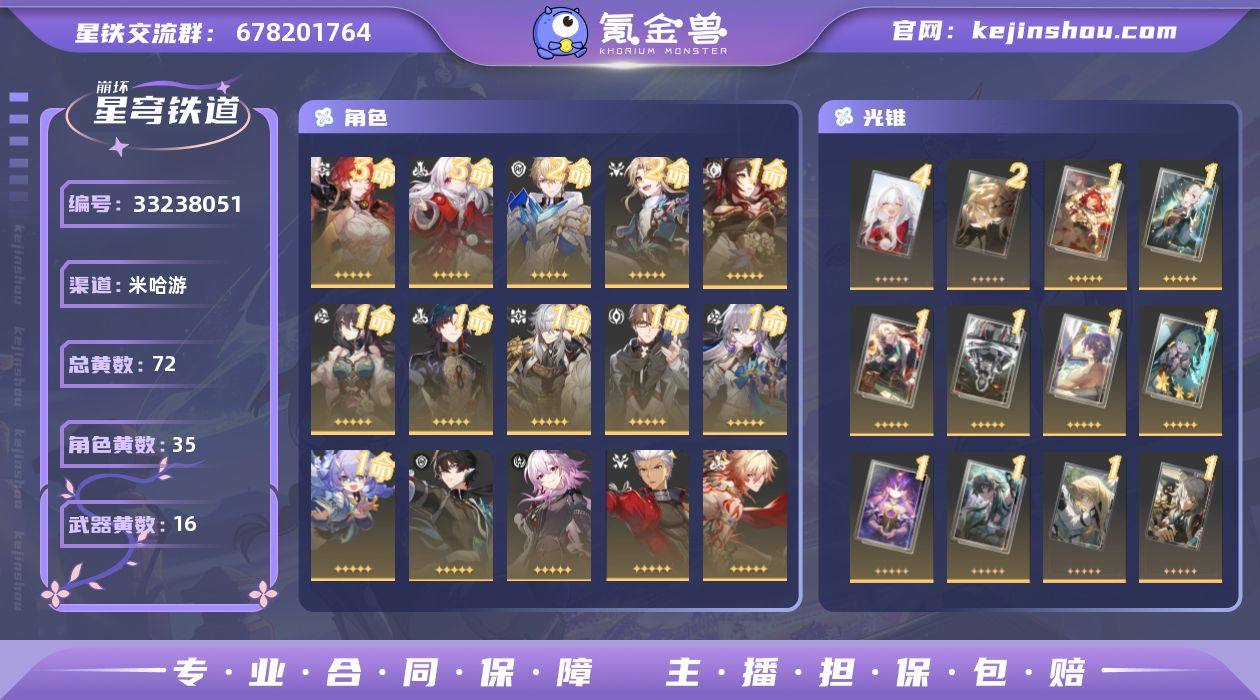 安全亮点:一手开服账号,游戏ID100开头。新老玩家都很好上手👍🏻 核心角色:黄泉0+1暴击72爆伤213、流萤0+1速度154击破特攻264、号上热门角色基本处于毕业面板。 稀缺资源:燃料53个、大经验书1178个、自塑尘脂8个、信用点一千万、后备开拓力2400满。 地图在3.2版本之后就没肝过了,有大量资源,可玩性高。