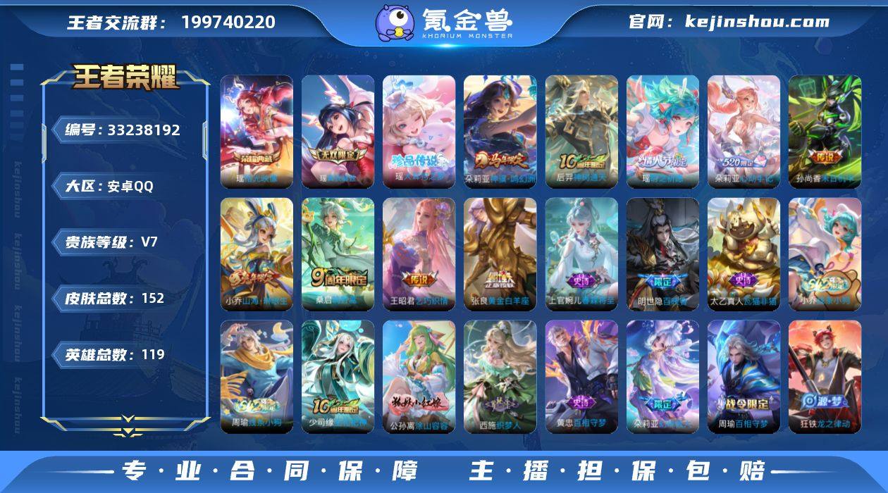 安卓Q-V7-最强王者段位-119英雄-152皮肤-1典藏皮肤-1无双-1珍品传说-9传说-45史诗 【英雄全皮】:孙权全皮,朵莉亚全皮,瑶全皮,敖隐全皮,空空儿全皮,影全皮,少司缘全皮 【荣耀典藏】:瑶拾光映像 【无双皮肤】:瑶真我赫兹 【珍品传说】:瑶大耳狗之梦 【传说皮肤】:朵莉亚神骥鸣幻洲,后羿神树通天,桑启鸣野蒿,朵莉亚心动手记,小乔山海琳琅生,瑶时之祈愿,王昭君乞巧织情,张良黄金白羊座,孙尚香末日机甲 【限定皮肤】:姜子牙天穹之誓,狄仁杰阴阳师,小乔山海琳琅生,赵云皇家上将,庄周高山流水,元歌无心,狄仁杰魔术师,项羽海滩派对,裴擒虎擒涛扼浪,瑶时之祈愿,瑶山海碧波行,西施玲珑珍味,西施至美乘鲤谣,鲁班大师探海日志,艾琳女武神,张良古海寻踪,妲己灵卜魔法,安琪拉乘龙聚宝船,沈梦溪龙舞盛年,朵莉亚心动手记,周瑜熔金海岸 【年限皮肤】:小乔山海琳琅生,瑶山海碧波行,安琪拉乘龙聚宝船 【赛季限定】:裴擒虎擒涛扼浪,鲁班大师探海日志,张良古海寻踪,姜子牙天穹之誓,太乙真人谧流熔炉,钟馗虚灵犬护,甄姬逆浪荇歌,亚瑟荣光之誓 【战令限定】:西施玲珑珍味,妲己灵卜魔法,周瑜百相守梦,孙策百相守梦,周瑜线条小狗,小乔线条小...
