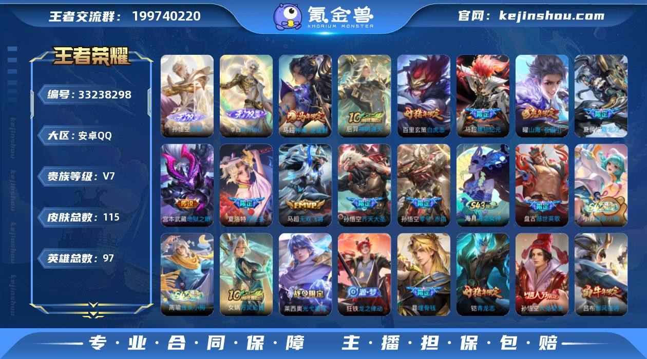 【极品男神号·金标万战马超·金标孙悟空·2无双11质量传说7按键·无相·碎月剑心·逐星野·霜北刀·苍雷引·白虎志】 安卓Q-V7-永恒钻石III段位-97英雄-115皮肤-2无双-11传说-32史诗 【英雄全皮】:孙权全皮,影全皮 【无双皮肤】:孙悟空无相,李白碎月剑心 【传说皮肤】:马超神骥逐星野,后羿神树通天,夏侯惇霜北刀,马超琥珀纪元,夏洛特浮生妄,孙悟空齐天大圣,曜山海苍雷引,马超无双飞将,孙悟空零号赤焰,百里玄策白虎志,宫本武藏地狱之眼 【限定皮肤】:夏侯惇霜北刀,暃埋骨钱,蔡文姬夏日便利店,狄仁杰阴阳师,赵云皇家上将,高渐离玩趣恶龙,吕布御风骁将,狄仁杰魔术师,狄仁杰万华元夜,项羽海滩派对,老夫子醍醐杖,程咬金演武夺筹,孙悟空大圣娶亲,孙悟空零号赤焰,孙悟空齐天大圣,钟馗驱傩正仪,鬼谷子原初探秘者,铠青龙志,百里玄策白虎志,弈星混沌棋,明世隐疑决卦,裴擒虎李小龙,云中君纤云弄巧,曜山海苍雷引,夏洛特浮生妄,鬼谷子天穹祈灯,李白碎月剑心,马超琥珀纪元,沈梦溪龙舞盛年,上官婉儿群星魔术团 【年限皮肤】:百里玄策白虎志,铠青龙志,吕布御风骁将,曜山海苍雷引 【赛季限定】:弈星混沌棋,明世隐疑决卦,老夫子醍醐杖,鬼谷子原初...