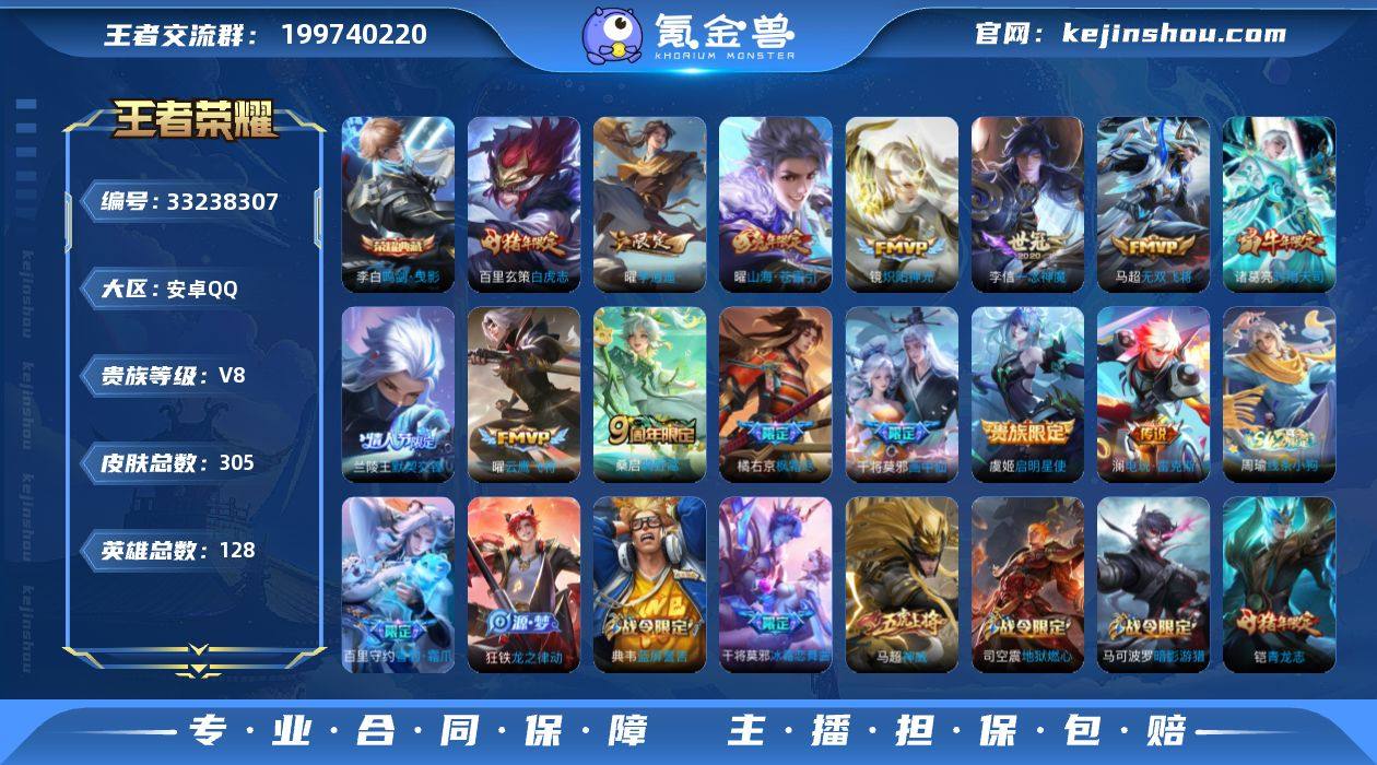 安卓Q-V8-尊贵铂金I段位-128英雄-305皮肤-1典藏皮肤-14传说-94史诗 【英雄全皮】:鲁班大师全皮 【荣耀典藏】:李白鸣剑曳影 【传说皮肤】:桑启鸣野蒿,澜电玩雷克斯,干将莫邪画中仙,曜山海苍雷引,橘右京枫霜尽,马超无双飞将,曜李逍遥 ,兰陵王默契交锋,诸葛亮时雨天司,镜炽阳神光,虞姬启明星使,曜云鹰飞将,李信一念神魔,百里玄策白虎志 【限定皮肤】:蔡文姬夏日便利店,大乔绒语心约,虞姬夏日便利店,姜子牙天穹之誓,杨戬破阵退雄兵,狄仁杰阴阳师,赵云皇家上将,赵云引擎之心,墨子神迹守卫,妲己时之奇旅,庄周高山流水,钟无艳超时空战士,扁鹊奇幻香踪,元歌云间偶戏,元歌无心,夏侯惇朔风刀,甄姬落雪兰心,曹操烛龙,典韦穷奇,典韦蓝屏警告,马可波罗暗影游猎,马可波罗山海玄木吟,狄仁杰魔术师,狄仁杰万华元夜,达摩沙漠行僧,项羽海滩派对,老夫子醍醐杖,老夫子航海奇遇记,关羽冰锋战神,程咬金演武夺筹,王昭君午后时光,兰陵王默契交锋,花木兰默契交锋,橘右京枫霜尽,亚瑟潮玩骑士王,李元芳银河之约,李元芳云中旅人,虞姬启明星使,钟馗神迹守卫,钟馗驱傩正仪,杨玉环遇见飞天,杨戬潮玩骑兵,干将莫邪冰霜恋舞曲,干将莫邪胡桃夹子,...