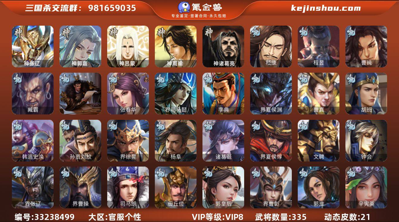 【JYSGS42】官阶:骠骑将军;VIP等级:VIP8;史诗武将数量:18;动态皮肤数量:21;武将总数:335;史诗宝珠数量:0;将魂数量:29;神将:3;魏国史诗武将:6;蜀国史诗武将:5;吴国史诗武将:2;群史诗武将:6