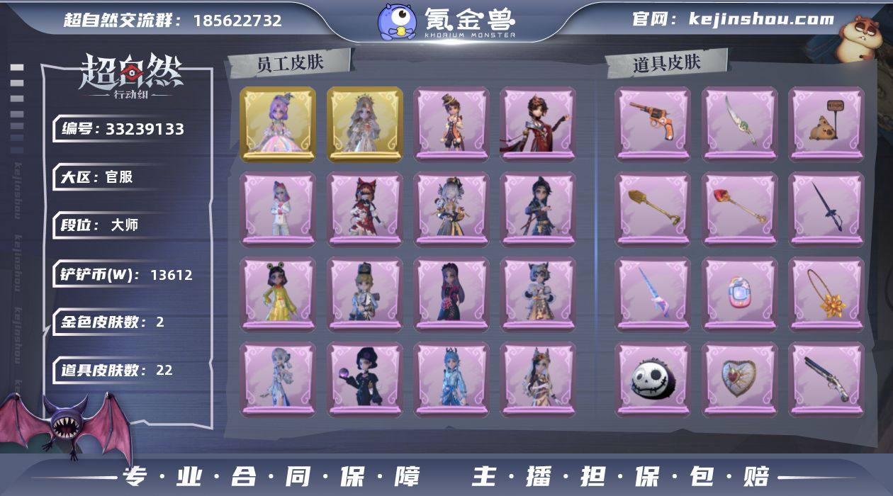 ZR728,粉皮:0,金皮:2,紫皮:15,道具皮:22,外观:薇薇安-圣光之谕,小黄-遗失的童话,阿念-庆宴绮愿,薇薇安-仙锋小姐,艾伦-绒绒对决,莉莉-莓果陷阱,莉莉-除妖小师妹,薇薇安-黑月挽歌,阿念-王子与骑士,莉莉-情公主,艾伦-水王子,薇薇安-白光莹,小黄-霓裳踏雪,巫铃儿-素影瑶光,爱丽丝-丝缕哀歌,逍遥-绣春逍影,小黄-呱呱雨衣,道具:铲子-圣心之泪,铲子-卡皮巴拉小黄豚铲,铲子-龙鳞,短管猎枪-星光的裁决,喷气背包-乘风溯雪,桃木剑-永眠曲,腰包-惊魂娃娃,刺刀-碧络琅环,音响-鸣沙鼓,转轮手枪-新星时代,夜视仪-金丝眼镜,腰包-宝剑八,急救包-蔷薇物语,桃木剑-最后的独角兽,摸金符-花落精绝,传送按钮-幻宠之门,背饰-潮汐小海兔,背饰-天使的呼唤,背饰-毛球夹子,背饰-在逃小新娘,员工:小黄,爱丽丝,零,阿念,逍遥,薇薇安,巫铃儿,莉莉,艾伦,爱德华,兰,小满,头饰:太空鲨头套,雪墩墩头套,樱桃奶油布丁,惊魂南瓜头套,小财神豚豚头套,鱼头怪头套,烈焰红唇头套,大葱明头套,火爆了头套,面具马头套,哈士奇头套,萨卡班甲鱼头套,嘻嘻头套,滑稽头套,呆滞头套,卑微头套,驼半仙头套,小狗蛇点点头套,炙热烧烤,像素朋克墨镜,后室幸存者头套,挂饰:未竟乐园,小鲨包包,天使消失的年代,钗头凤,动作:luvaboy,鹏友摇,心...