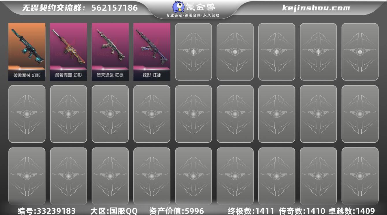 【套装】:VCT 2026 赛季套装 【英雄】:炼狱,维斯,暮蝶,铁臂,捷风,雷兹,幽影,不死鸟,贤者,猎枭,芮娜,斯凯,盖可,黑梦 【近战武器】:近战武器-VCT 2026 篆刀,近战武器-紫金爪刀 【狂徒】:狂徒-堕天遗武,狂徒-掠影 【幻影】:幻影-破败军械,幻影-般若假面 【卡面】:战术桌游 卡面,树懒大作战 卡面,Clutch 卡面,零点嗅探设计图 卡面,无畏契约GO!第一卷:芮娜 卡面,无畏契约GO!第一卷:零 卡面,蝰蛇vs幽影 卡面,钢锁vs盖可 卡面,代号红色 卡面,新兵报到 卡面,V契约 卡面,无畏契约 卡面 【喷漆】:买装还是存钱 喷漆,暴走萝莉 喷漆,放下武器 喷漆,胜利属于无畏契约 喷漆,GLHF 喷漆,无畏契约 喷漆 【挂饰】:无畏契约GO!第一卷 零 挂饰,天外飞客 挂饰,无畏契约 纪念币 挂饰