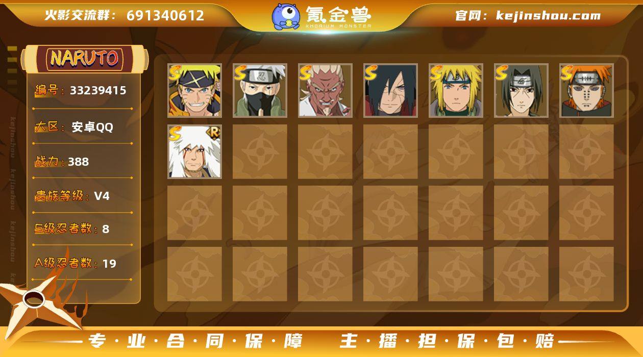 实名: 可修改 贵族等级: V4 S忍数: 8 A忍数: 19 战力值(万): 388 S级忍者: 佩恩「天道」,波风水门,宇智波鼬 「须佐能乎」,自来也 「舞之豪杰」,宇智波斑「秽土转生·解」,艾「忍界大战」,旗木卡卡西「须佐能乎」,漩涡鸣人·宇智波佐助 亮点: 【优质装备】:宇智波斑「秽土转生·解」,艾「忍界大战」,旗木卡卡西「须佐能乎」 霸体lv4