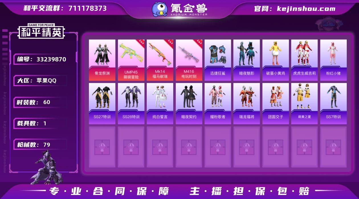 ZMH1391【1载具-1粉装-3特效】苹果手Q-1载具-1粉装-3特效枪-60套装-79枪皮-5王牌印记-不朽星钻Ⅰ-24388热力值【1载具】玛莎拉蒂Ghibli(粉)【1粉装】骨龙祭渊【3特效枪】M416-电玩时刻[5级],Mk14-福马献瑞[5级],UMP45-萌骑冒险[4级]【1稀有】SS1特训【3飞行器】鎏金朋克飞行器,马上有福飞行器,红色滑翔尾迹【1头盔】梦幻火箭头盔【1背包】梦幻火箭背包【134其它衣服和枪皮】黄色名流,青春冒险家,SS28特训,电音精灵,SS33特训,团圆交子,缤纷果语,SS15特训,传奇侦探,北国孤狼,耀眼新星,SS35特训,SS14特训,福马献瑞,狙击之神,潮流炫酷,SS38特训,竞技勇士朋克,SS2特训,SS18特训,萌黄之夏,耀粉歌者,纯白誓言,跃动心情,海盐绵绵冰,飞行日记,黄色伏地魔,燃烧卡路里,竞技达人朋克,幻世战舞者,长空猛禽,暗夜魅影,海岛探路者,SS7特训,SS17特训,战地菁英,潮流游乐家,SS36特训,角色-瑰石海星,虎虎生威吉莉,竞技名士,SS27特训,迅捷狂鲨,破蛋小黄鸡,刚毅裁决者,SS8特训,白色伏地魔,瑞龙福将,暗夜契约,香桃花海,粉红小猪,疯狂小兔子,光之冒险,SS6特训,SS37特训,马上来财,福星高照,SS19特训,撬棍-传奇侦探,AUG-天降萌叽,蜜獾-天降萌叽,TMP-9-江南烟雨,GROZA-福马献瑞,Win94-瑞龙福将,燃烧瓶-福马...