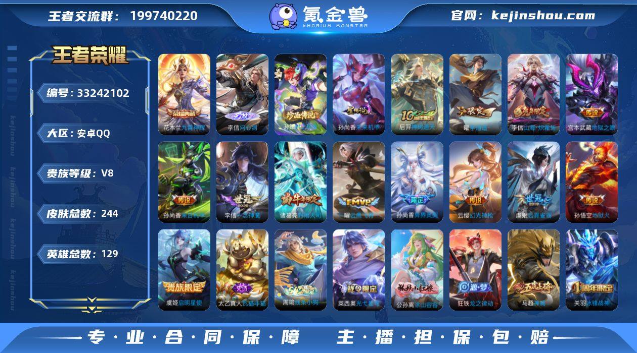 安卓Q-V8-永恒钻石IV段位-129英雄-244皮肤-1典藏皮肤-1无双-1珍品传说-13传说-79史诗 【英雄全皮】:李信全皮,敖隐全皮 【荣耀典藏】:花木兰九霄神辉 【无双皮肤】:李信问心剑 【珍品传说】:孙策时之奇旅 【传说皮肤】:后羿神树通天,云缨幻光神枪,李信山海炽霜斩,孙尚香异界灵契,曜李逍遥 ,诸葛亮时雨天司,虞姬启明星使,曜云鹰飞将,李信一念神魔,虞姬云霓雀翎,孙尚香末日机甲,宫本武藏地狱之眼,孙悟空地狱火 【限定皮肤】:蒙犽顽岩魄,虞姬夏日便利店,姜子牙天穹之誓,狄仁杰阴阳师,赵云皇家上将,墨子神迹守卫,嬴政优雅恋人,孙尚香蔷薇恋人,孙尚香异界灵契,鲁班七号乒乒小将,高渐离玩趣恶龙,孙膑天狼运算者,芈月幻夜卜梦,元歌云间偶戏,元歌无心,狄仁杰魔术师,狄仁杰万华元夜,达摩星际陆战队,达摩沙漠行僧,项羽海滩派对,老夫子航海奇遇记,关羽冰锋战神,程咬金演武夺筹,王昭君午后时光,兰陵王金庭之子,亚瑟潮玩骑士王,牛魔奔雷神使,后羿圣弓游侠,李元芳云中旅人,虞姬启明星使,钟馗驱傩正仪,干将莫邪真爱魔法,雅典娜黎明之约,太乙真人华丽摇滚,鬼谷子原初探秘者,鬼谷子五谷丰年,诸葛亮时雨天司,黄忠火炮绅士,苏烈千军破阵...