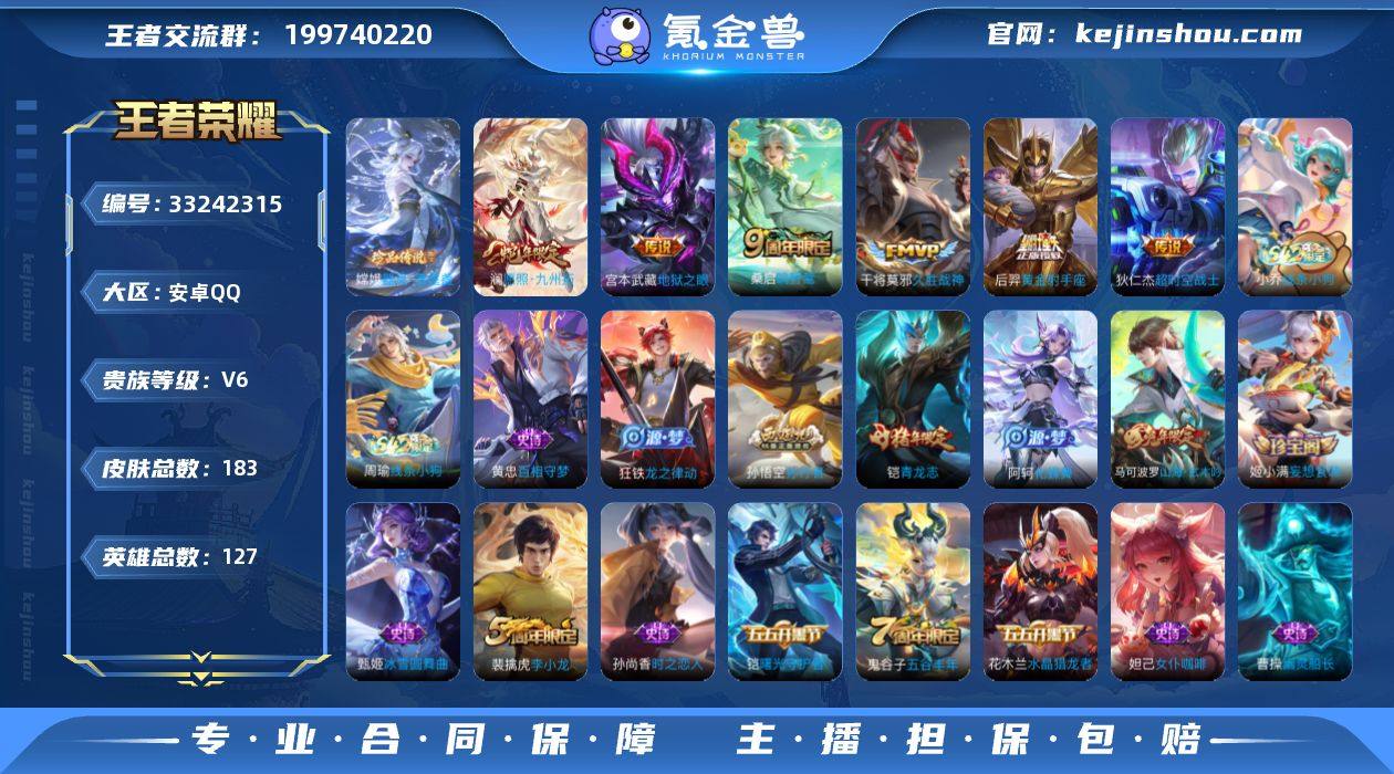 安卓Q-V6-至尊星耀V段位-127英雄-183皮肤-1珍品传说-6传说-41史诗 【珍品传说】:嫦娥器灵落星盏 【传说皮肤】:澜愿照九州拓,桑启鸣野蒿,干将莫邪久胜战神,后羿黄金射手座,宫本武藏地狱之眼,狄仁杰超时空战士 【限定皮肤】:姜子牙天穹之誓,狄仁杰阴阳师,赵云皇家上将,孙尚香蔷薇恋人,庄周高山流水,夏侯惇朔风刀,马可波罗山海玄木吟,狄仁杰魔术师,狄仁杰万华元夜,项羽海滩派对,关羽百相守梦,兰陵王金庭之子,孙悟空孙行者,李元芳云中旅人,蔡文姬繁星吟游,鬼谷子五谷丰年,铠青龙志,弈星混沌棋,沈梦溪大漠名商,明世隐疑决卦,裴擒虎李小龙,裴擒虎擒涛扼浪,鲁班大师探海日志,桑启海盐诗旅,阿古朵江河有灵,张良古海寻踪,蒙犽百解令,蒙恬荣光圣徽,鬼谷子天穹祈灯,姬小满妄想食味,刘邦剑破天穹,程咬金群星魔术团,周瑜熔金海岸 【年限皮肤】:铠青龙志,马可波罗山海玄木吟,澜愿照九州拓 【赛季限定】:夏侯惇朔风刀,弈星混沌棋,明世隐疑决卦,狄仁杰万华元夜,兰陵王金庭之子,沈梦溪大漠名商,李元芳云中旅人,桑启海盐诗旅,裴擒虎擒涛扼浪,鲁班大师探海日志,张良古海寻踪,鬼谷子天穹祈灯,刘邦剑破天穹,姜子牙天穹之誓,东皇太一噬灭...