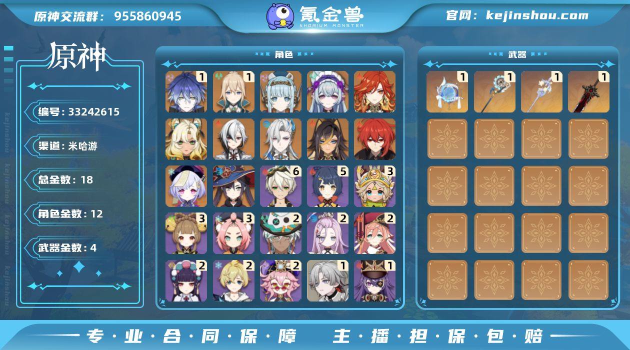 18黄! 冒险等级: 57 1命金色角色: 一命琴,一命菲林斯 0命金色角色: 迪卢克,七七,莫娜,迪希雅,那维莱特,阿蕾奇诺,希诺宁,玛薇卡,梦见月瑞希,伊涅芙 拥有武器: 狼的末路,柔灯挽歌,支离轮光 1精武器: 狼的末路,柔灯挽歌,支离轮光,帷间夜曲 亮点: 垫35抽,10粉球