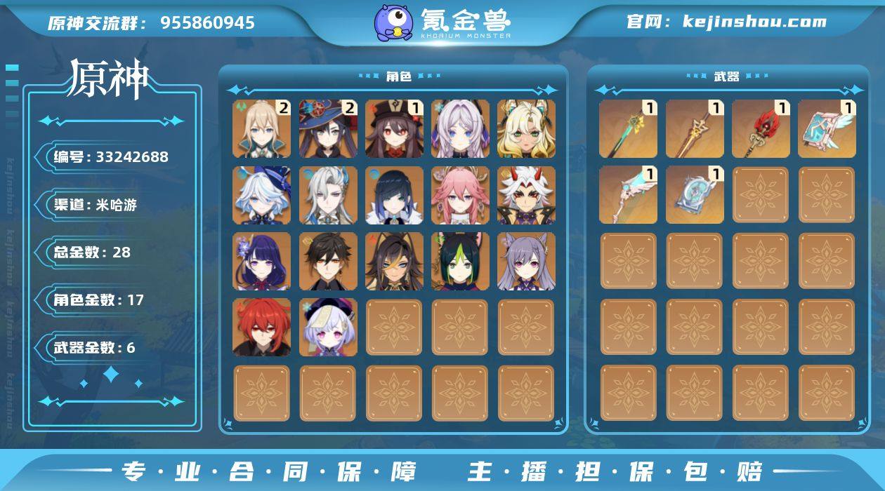 57级/28黄/女主/17个五星角色/6个五星武器 0命芙宁娜,0命那维莱特,0命迪希雅,0命提纳里,0命夜兰,0命八重神子,0命荒泷一斗,0命雷电将军,0命钟离,1命胡桃,0命刻晴,0命七七,2命琴,2命莫娜,0命迪卢克,0命希诺宁,0命茜特菈莉,精1圣显之钥,精1护摩之杖,精1四风原典,精1天空之翼,精1天空之卷,精1岩峰巡歌