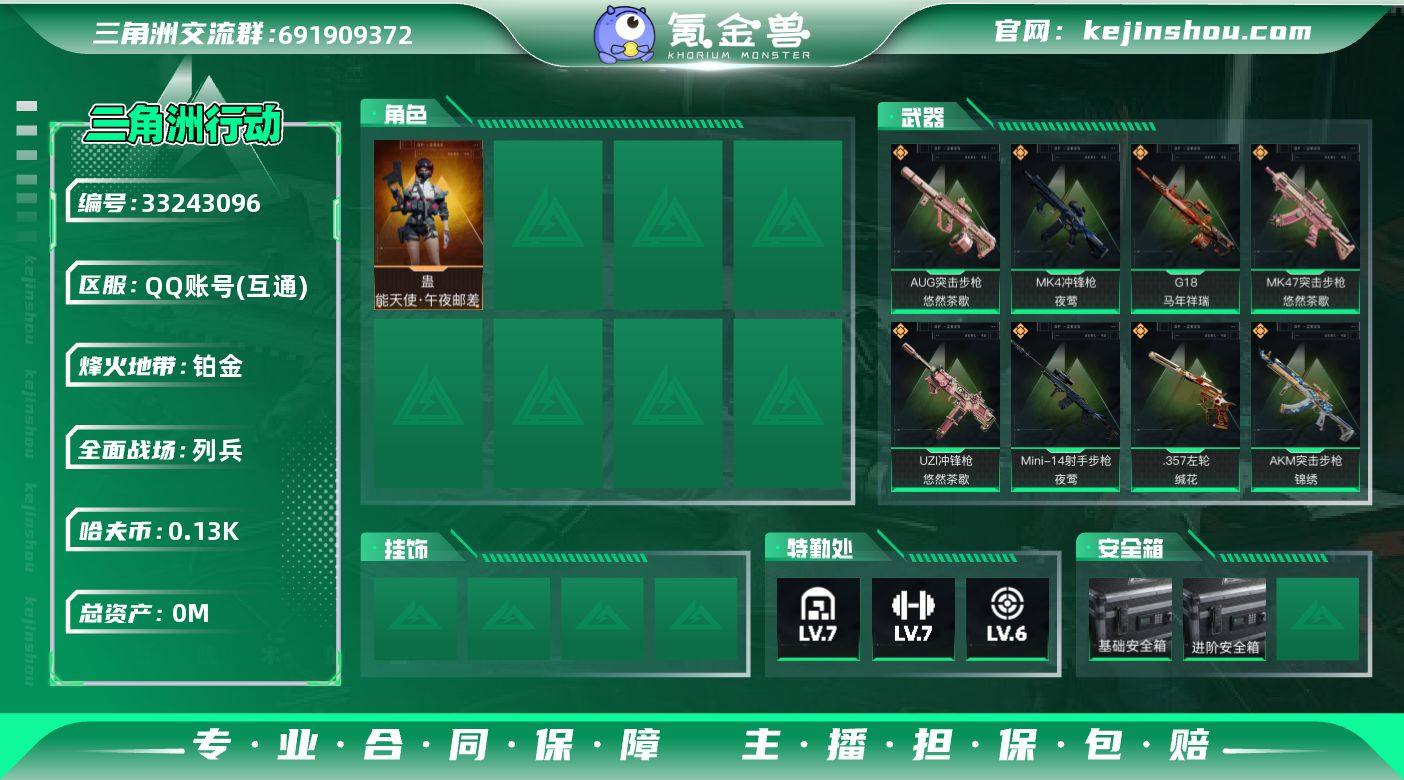实名: 不可修改 烽火地带段位: 铂金 全面战场段位: 列兵 总资产: 241 哈夫币: 134 干员外观: 蛊-能天使·午夜邮差 传说武器皮肤: SMG45冲锋枪-骑士,M4A1突击步枪-阿米娅,AWM狙击步枪-捞点薯条,93R-捞点薯条,勇士冲锋枪-能天使-午夜邮差,ASh-12战斗步枪-鹅鸭杀,QJB201轻机枪-鹅鸭杀,KC17突击步枪-电锯惊魂,K416突击步枪-行动记录,G18-马年祥瑞,MK4冲锋枪-夜莺,Mini-14射手步枪-夜莺,.357左轮-缄花,SR-25射手步枪-缄花,M14射手步枪-缄花,SMG-45冲锋枪-锦绣,AKM突击步枪-锦绣,MK47突击步枪-悠然茶歇,AUG突击步枪-悠然茶歇,UZI冲锋枪-悠然茶歇