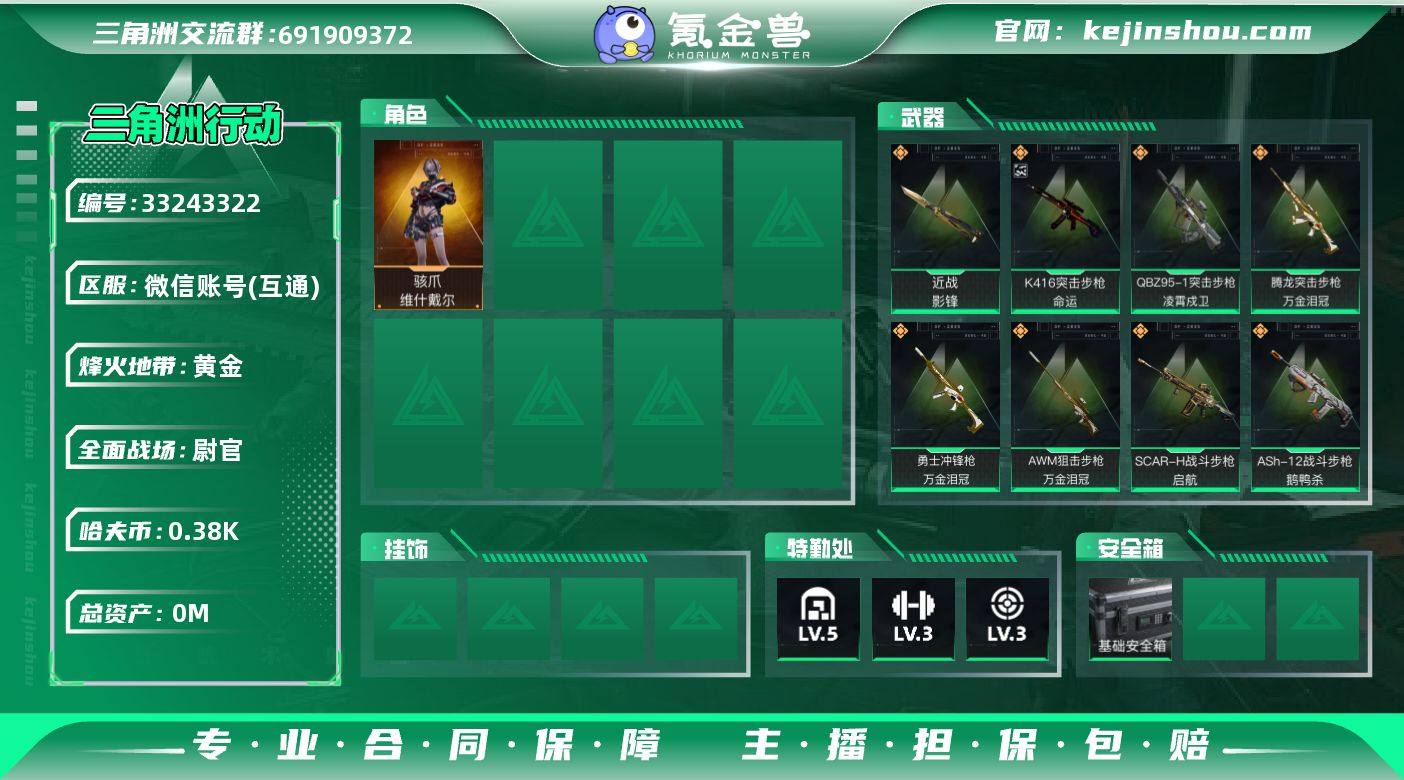 实名: 可修改 烽火地带段位: 黄金 全面战场段位: 尉官 总资产: 7 哈夫币: 383 干员外观: 骇爪-维什戴尔 传说武器皮肤: 近战-影锋,K416突击步枪-命运(典藏),M4A1突击步枪-阿米娅,R93狙击步枪-维什戴尔,SCAR-H战斗步枪-启航,ASh-12战斗步枪-鹅鸭杀,QCQ171冲锋枪-鹅鸭杀,QJB201轻机枪-鹅鸭杀,QBZ95-1突击步枪-凌霄戍卫,勇士冲锋枪-万金泪冠,腾龙突击步枪-万金泪冠,AWM狙击步枪-万金泪冠 亮点: 【优质装备】:近战-影锋,K416突击步枪-命运(典藏)