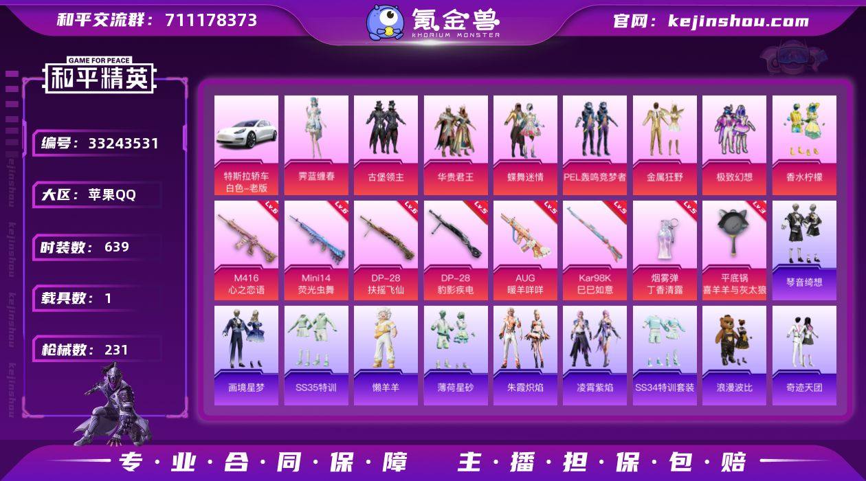实名: 可修改 时装数: 639 载具数: 1 枪械数: 231 战备数: 1 热门装扮: 蝶舞迷情,古堡领主,浪漫波比,金属狂野,香水柠檬,PEL轰鸣竞梦者,极致幻想,华贵君王,仓鼠灰灰,大橘为重,激萌罗小黑,奇迹天团,软萌银虎,神秘黑猫,霁蓝缠春 载具: 特斯拉Model 3(珍珠白) 稀有枪皮: Mini14荧光虫舞,DP-28扶摇飞仙,M416心之恋语,Kar98K-巳巳如意,烟雾弹-丁香清露,AUG-暖羊咩咩,平底锅-喜羊羊与灰太狼,DP-28-豹影疾电