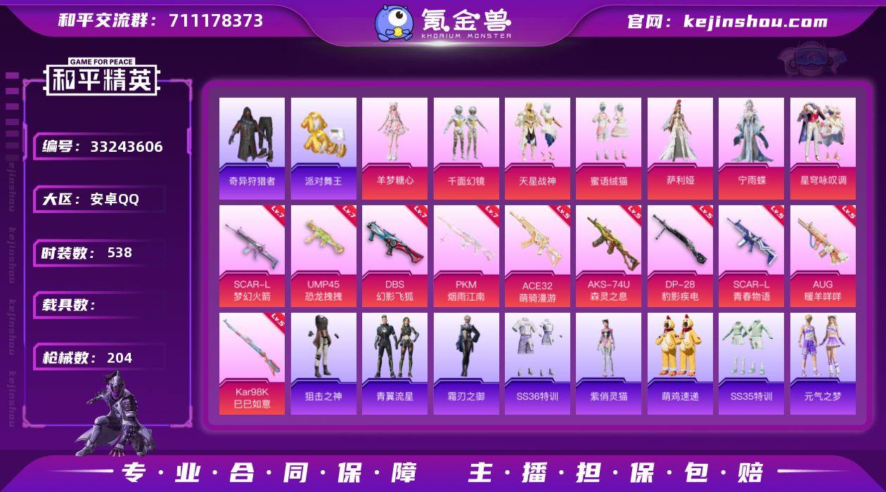 实名: 可修改 时装数: 538 枪械数: 204 热门装扮: 奇异狩猎者,千面幻镜,派对舞王,天星战神,蜜语绒猫,萨利娅,星穹咏叹调,宁雨蝶,羊梦糖心 稀有枪皮: SCAR-L梦幻火箭,SCAR-L青春物语,UMP45恐龙拽拽,PKM江南烟雨,Kar98K-巳巳如意,AUG-暖羊咩咩,DBS-幻影飞狐,DP-28-豹影疾电,AKS-74U-森灵之息,ACE32-萌骑漫游 亮点: 【优质装备】:派对舞王(小金鞋),舞王派对(派对舞王、小金鞋),奇异狩猎者,七级PKM-江南烟雨,七级UMP45-恐龙拽拽,七级SCAR-L-梦幻火箭,七级DBS-幻影飞狐