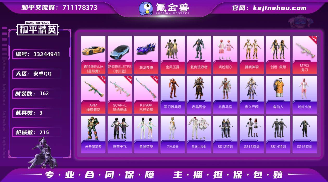 安卓 手Q-5粉装-5特效枪-3载具-3粉色飞行器-72109热力值-11王牌印记-162套装-215枪皮【热门品类】:角色-军刀雅典娜,角色-忠猛周仓,角色-忠真马岱,角色-忠义严颜,套装-龟仙人,套装-粉红小猪,大砍刀-青龙偃月刀【粉色套装】:粉装-金风玉露,角色-复仇流浪者,粉装-飒粉甜心,粉装-拂晓神骑,套装-创世·救赎【粉色枪皮等级】:AKM-绿萝繁花(五级),SCAR-L-锦绣绵绵(五级),M762-鬼刀(六级),ACE32-萌骑漫游(五级),Kar98K-巳巳如意(三级)【粉色载具】:路特斯EVIJA(星际黄),路特斯ELETRE(冰川蓝),海龙奔腾【粉色枪皮】:AKM-绿萝繁花,SCAR-L-锦绣绵绵,M762-鬼刀,ACE32-萌骑漫游,Kar98K-巳巳如意