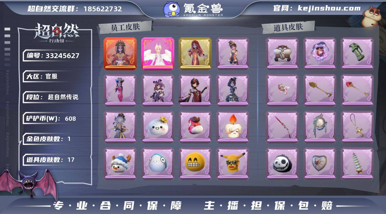 红皮1;粉皮1;金皮1;紫皮6;道具皮17;皮肤:小黄-炽天使,巫铃儿-镜生遗梦,巫铃儿-镜花辞,薇薇安-仙锋小姐,阿念-庆宴绮愿,小黄-异色序曲,兰-千夜星谕,莉莉-除妖小师妹,爱丽丝-耀眼的你;道具:折扇-露露扇,铲子-圣心之泪,传送按钮-昆仑镜,闪光弹-金戈玄铜,电击枪-甜蜜泡泡枪,腰包-惊魂娃娃,葫芦-伏妖塔,音响-happy猫,铲子-龙鳞,腰包-宝剑八,摸金符-祝祷词,急救包-土拨鼠捏捏,黄牛能量饮料-青玉抱丹,额外的背包-飞花令,桃木剑-凤鸣九天,夜视仪-金丝眼镜,伞-伞;饰品:头饰-哈士奇头套,头饰-腊肠扭扭,头饰-太空鲨头套,头饰-雪墩墩头套,头饰-萨卡班甲鱼头套,头饰-卑微头套,头饰-烈焰红唇头套,头饰-面具马头套,头饰-呆滞头套,头饰-鱼头怪头套,头饰-嘻嘻头套,头饰-滑稽头套,头饰-芝麻糊汤圆,头饰-蒜了八,头饰-马上有钱,头饰-烛光纪念,头饰-像素朋克墨镜,头饰-后室幸存者头套,挂饰-钗头凤,挂饰-糖果守卫,背饰-炽天使的余烬,背饰-牛啤背包,背饰-梵音莲华,背饰-蝶恋花;动作:动作-胜利之舞,动作-新年摇,动作-鹏友摇,动作-心跳摇,动作-刀马舞,动作-鞭子舞,动作-舞台中心,动作-拜年,动作-举牌,动作-抬手;工牌背景:工牌背景-珊瑚海,工牌背景-卷珠帘,工牌背景-复活的肖像,工牌背景-鸢...
