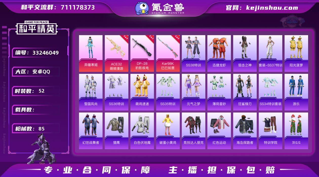 可二次【3特效枪1粉装 秒换绑不用等】 安卓Q区-17741热力值-52套装-85枪皮 【1粉装】 角色-异瞳寒姬【3特效枪】 ACE32-萌骑漫游(5级) Kar98K-巳巳如意(5级) DP-28-豹影疾电(5级)【92热门】 白色伏地魔 SCAR-L-玉兔迎春 M762-天降萌叽 M762-彩虹符号 SKS-糯团青竹 DBS-彩虹符号 MG3-幻世战舞者 AKM-星之彼岸 M416-蓝色火焰 破蛋小黄鸡 特训学院 青年教官 魅力单车 猎鹰 蓝色运动 竞技达人朋克 黄色运动 黄色伏地魔 红色运动 黑色伏地魔 海岛探路者 春日漫步 S1897-糯团青竹 P90-紫矿核心 GROZA-紫矿核心 顶瓜瓜 GROZA-福马献瑞 恋语绒绒 SS34特训 蜜獾-鸡智如我 AWM-天降萌叽 大橘大利 莫辛纳甘-鸢尾珑雾 PKM-啾咪啾咪 SS33特训 SS32特训 巳巳如意 游乐 MG3-霓彩脉冲 狂鲨锋刃 SS36特训 大砍刀-像素花束 MG3-火熔核心 异域银装 战术大师 蜜獾-启元战纹 迅捷龙虾 短管霰弹-星穹咏叹调 狙击之神 破片手榴弹-海盐豹豹 UMP45-海盐豹豹 ARX-像素花束 Mk14-紫晶流影 Mk14-薄荷星砂 AUG-紫晶流影 AMR-鸡智如我 SS38特训 破片手榴弹-巳巳如意 AKM-涂鸦街区 AKS-74U-鸡智如我 平底锅-精灵梦叶罗丽 烟雾弹-冰氧夏日 平底锅-属我最6 SS35特训 薄荷星砂 元气之梦 街头风暴 S12K-霓彩脉冲 AK...