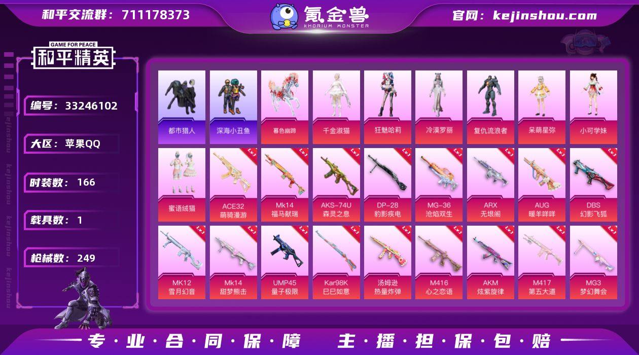 【连体号都市猎人红眼罩小丑女19特效枪7粉装1载具 送王者1珍品1典藏14传说200皮肤 秒换绑不用等】 苹果Q区-83316热力值-166套装-249枪皮 【1载具】 暮色幽蹄【2稀有】 都市猎人 红眼罩【7粉装】 狂魅哈莉(小丑女) 蜜语绒猫 复仇流浪者 呆萌星弥 小可学妹 角色-冷漠罗丽 角色-千金淑猫【19特效枪】 M416-心之恋语(7级) AKM-炫紫旋律(5级) AKS-74U-森灵之息(5级) Mk14-福马献瑞(3级) ACE32-萌骑漫游(5级) SCAR-L-锦绣绵绵(5级) M417-第五大道(5级) MG3-梦幻舞会(5级) ARX-无垠阁(6级) M762-电糖天使(5级) 汤姆逊-热量炸弹(5级) MK12-雪月幻音(4级) Kar98K-巳巳如意(5级) Mk14-甜梦熊击(5级) AUG-暖羊咩咩(5级) DP-28-豹影疾电(5级) MG-36-沧焰双生(5级) UMP45-量子极限(5级) DBS-幻影飞狐(4级)【244热门】 深海小丑鱼 暗影哥特(红眼罩) 都市猎人(蓝口罩) 小丑鱼 迅捷狂鲨 极速红龙 豚鼠丹丹 SS27特训 SS26特训 SS25特训 SS24特训 SS23特训 SS22特训 Mk47-洛神天依 M762-暖熊萌萌 AKM-缤纷海域 SCAR-L-玉兔迎春 GROZA-田园牧歌 GROZA-恐龙拽拽 M762-天降萌叽 M762-彩虹符号 Mk47-乌木金纹 SKS-糯团青竹 Mini14-旋转彩虹 UZI-娇憨猪猪 UMP45-蓝色火焰 UMP45-炫光之旅 DBS-彩虹符...