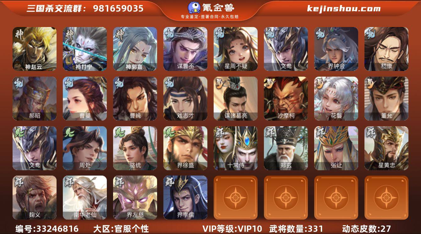 标题:S37115 VIP等级:VIP10 官阶:大将军 史诗武将数量:35 动态皮肤数量:27 史诗宝珠数量:11 将魂数量:1425 雁翎数量:25951 心愿积分:688 史诗武将(魏国):文鸯,谋曹丕,曹婴,界钟会,戏志才,势辛宪英,司马昭,星周不疑,嵇康,程昱,曹纯,郝昭 史诗武将(蜀国):谋诸葛亮,沙摩柯,花鬟,董允 史诗武将(吴国):界徐盛,骆统,周处,文鸯 史诗武将(群雄):十常侍,星董卓,界左慈,南华老仙,麹义,司马昭,郑玄,界李儒,星黄忠,张让,左慈,兀突骨,沮授,陶谦 史诗武将(神将):神郭嘉,神甘宁,神赵云