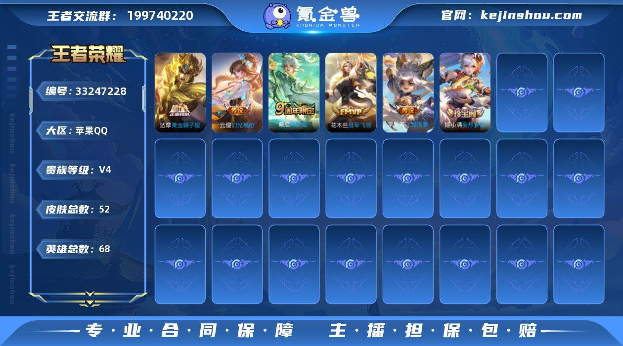 苹果Q 不可二次 6传说 68英雄52皮肤 踏浪归 幻光神枪 鸣野蒿 冠军飞将 黄金狮子座 飞鸢探春 冰冠公主 水晶猎龙者 暗隐猎兽者 妄想食味 千年之狐 紫霞仙子 幽灵船长 末日机甲男 街头霸王 未来纪元赵云 水果甜心 鹰眼统帅 王者和平一体号