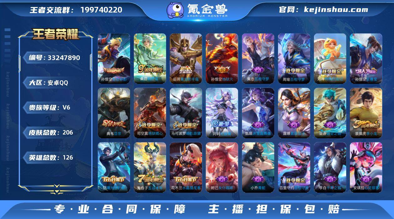 无二次-安卓Q-V6-最强王者段位-124英雄-206皮肤-1典藏皮肤-3传说-57史诗 【荣耀典藏】:孙悟空全息碎影 【传说皮肤】:桑启鸣野蒿,后羿黄金射手座,孙悟空地狱火 【限定皮肤】:蔡文姬夏日便利店,虞姬夏日便利店,姜子牙天穹之誓,狄仁杰阴阳师,赵云皇家上将,孙尚香蔷薇恋人,芈月重明,夏侯惇朔风刀,曹操烛龙,典韦岱宗,马可波罗暗影游猎,狄仁杰魔术师,狄仁杰万华元夜,达摩沙漠行僧,项羽海滩派对,老夫子醍醐杖,程咬金演武夺筹,兰陵王金庭之子,亚瑟潮玩骑士王,孙悟空至尊宝,牛魔御旌,李元芳银河之约,李元芳云中旅人,钟馗驱傩正仪,雅典娜单词大作战,蔡文姬繁星吟游,鬼谷子原初探秘者,鬼谷子五谷丰年,苏烈千军破阵,弈星混沌棋,沈梦溪星空之诺,沈梦溪大漠名商,明世隐疑决卦,裴擒虎李小龙,裴擒虎擒涛扼浪,狂铁御狮,米莱狄御霄,云中君纤云弄巧,盾山御銮,猪八戒西部大镖客,上官婉儿梁祝,鲁班大师探海日志,桑启海盐诗旅,艾琳女武神,艾琳流音漫舞,司空震地狱燃心,阿古朵江河有灵,张良古海寻踪,蒙犽百解令,高渐离燃音魔法,妲己灵卜魔法,鬼谷子天穹祈灯,沈梦溪龙舞盛年,鲁班七号蔬乡物语,李元芳蔬乡物语,刘邦剑破天穹,程咬金群星魔...