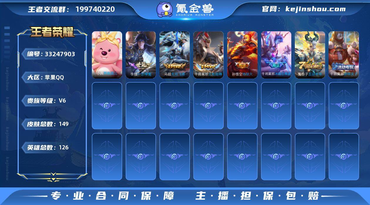 苹果Q 不可二次 金标 黄忠 程咬金 6传说 1星传 金貂蝉 126英雄149皮肤 愿照岁时盈 愿照九州拓 无双飞将 地狱火 久胜战神 一念神魔 万灵启世 逐霄之志 默契交锋女 冰霜恋舞曲 原初追逐者 赞萌露比 黄忠百相守梦 飞车小橘子 星界特工 唤灵魅影 原初探秘者 水晶猎龙者 暗隐猎兽者 猫狗日记男 金属风暴 特工魅影 曙光守护者 特工战影 青蛇 胡桃夹子 逐浪之夏 紫霞仙子 功夫厨神 圣诞恋歌 幽灵船长 末日机甲男 节奏热浪 时之恋人女 暗夜贵公子 街头霸王 摇滚巨星 鬼剑武藏 德古拉伯爵 冰雪圆舞曲 万华元夜 东方不败 演武夺筹 驱傩正仪 千军破阵 拳王 沙漠行僧 女仆咖啡 金庭之子 霸王丸 大漠名商 敏锐之力 云中旅人 丁香结 海盐诗旅 皇家上将 擒涛扼浪 魅力维加斯 探海日志 水果甜心 古海寻踪 无心 五谷丰年 乱世虎臣 鹰眼统帅 魔术师 王者荣耀账号
