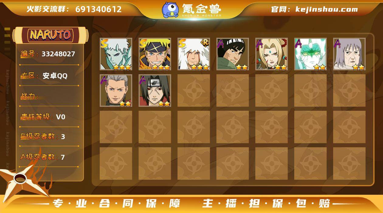 【HYYT418】V0/S忍3/A忍7/三星S-自来也「舞之豪杰」/二星A-巳月「仙人模式」/三星S-宇智波带土「十尾人柱力」/二星A-宇智波鼬/二星A-迈特凯「青春爆炸」/2星小南「神驹佑将」/二星A-纲手「妖怪奇谭」/二星A-飞段/二星A-千代「近松十人卫」/三星S-漩涡鸣人·宇智波佐助