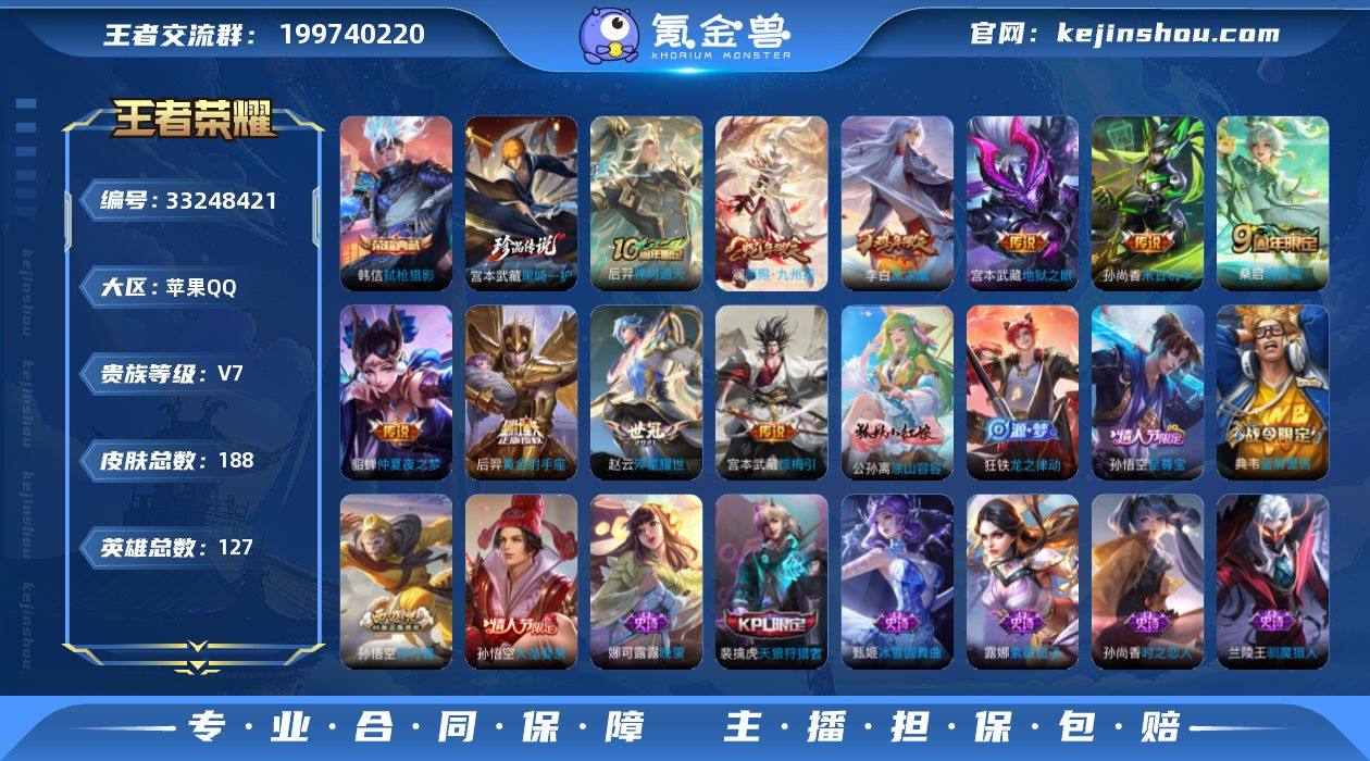 苹果Q-V7-荣耀黄金I段位-127英雄-188皮肤-1典藏皮肤-1珍品传说-10传说-51史诗【英雄全皮】:宫本武藏全皮【荣耀典藏】:韩信弑枪猎影【珍品传说】:宫本武藏黑崎一护【传说皮肤】:后羿神树通天,澜愿照九州拓,桑启鸣野蒿,宫本武藏惊梅引,赵云淬星耀世,后羿黄金射手座,貂蝉仲夏夜之梦,李白凤求凰,孙尚香末日机甲,宫本武藏地狱之眼【限定皮肤】:白起狰,狄仁杰阴阳师,赵云皇家上将,嬴政白昼王子,鲁班七号狮舞东方,芈月重明,吕布猎兽之王,周瑜赤莲之焰,夏侯惇朔风刀,曹操烛龙,典韦穷奇,典韦蓝屏警告,狄仁杰魔术师,项羽海滩派对,貂蝉逐梦之音,韩信逐梦之影,兰陵王驯魔猎人,花木兰瑞麟志,孙悟空至尊宝,孙悟空大圣娶亲,孙悟空孙行者,牛魔御旌,钟馗神迹守卫,女娲朔望之晖,蔡文姬繁星吟游,太乙真人饕餮,弈星混沌棋,梦奇顽趣,沈梦溪大漠名商,裴擒虎天狼狩猎者,狂铁御狮,米莱狄御霄,盾山御銮,上官婉儿梁祝,鬼谷子天穹祈灯,鲁班七号蔬乡物语,李元芳蔬乡物语,刘邦剑破天穹,程咬金群星魔术团,镜青焰无极,项羽苍威无极【年限皮肤】:李白凤求凰,花木兰瑞麟志,澜愿照九州拓【赛季限定】:白起狰,太乙真人饕餮,曹操烛龙,芈月重明,典韦...