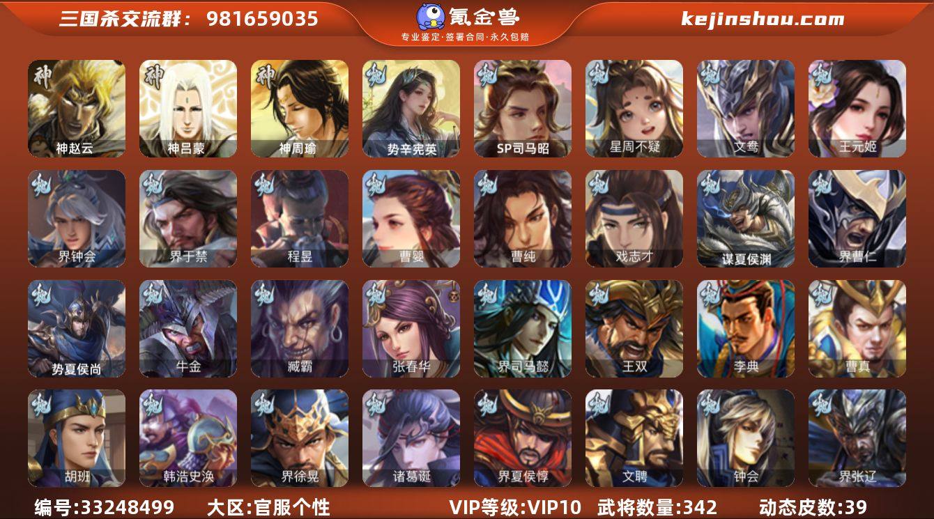 【14790099】官阶:大将军;VIP等级:VIP10;史诗武将数量:33;动态皮肤数量:39;武将总数:342;史诗宝珠数量:0;将魂数量:1495;神将:1;魏国史诗武将:14;蜀国史诗武将:6;吴国史诗武将:7;群史诗武将:10