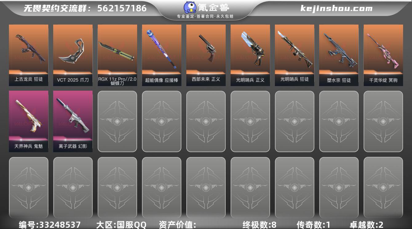 【套装】:VCT 2025 赛季套装【英雄】:幻棱,炼狱,维斯,暮蝶,钛狐,壹决,捷风,雷兹,幽影,不死鸟,贤者,猎枭,零,芮娜,奇乐,尚勃勒,霓虹,斯凯,夜露,盖可,黑梦,钢锁【近战武器】:近战武器-RGX 11z Pro//2.0 蝴蝶刀,近战武器-VCT 2025 爪刀,近战武器-超能偶像 应援棒【狂徒】:狂徒-光明哨兵,狂徒-塑水宗,狂徒-上古龙炎,狂徒-超能偶像【幻影】:幻影-离子武器,幻影-聚合之力【戍卫】:戍卫-超能偶像【獠犬】:獠犬-采蜜小蜂队【冥驹】:冥驹-千灵华绽【飞将】:飞将-聚合之力【战神】:战神-采蜜小蜂队【判官】:判官-超能偶像,判官-采蜜小蜂队【蜂刺】:蜂刺-聚合之力【标配】:标配-超能偶像【正义】:正义-光明哨兵,正义-西部未来,正义-超限闪存,正义-纳米打击【鬼魅】:鬼魅-天界神兵,鬼魅-采蜜小蜂队,鬼魅-宿怨,鬼魅-星云暗涌【狂怒】:狂怒-聚合之力【卡面】:进入射程 卡面,《双城之战》拥抱 卡面,精灵大战 卡面,欢迎来到底城 卡面,南瓜盛典 卡面,修车达人 卡面,正义的化身 卡面,终章:生意人麦宝 卡面,铁之华 卡面,失而复得 卡面,时间到 卡面,最高舞台 卡面,复活专家 卡面,归乡 // 蝰蛇 卡面,超能偶像 卡面,生意人麦宝...