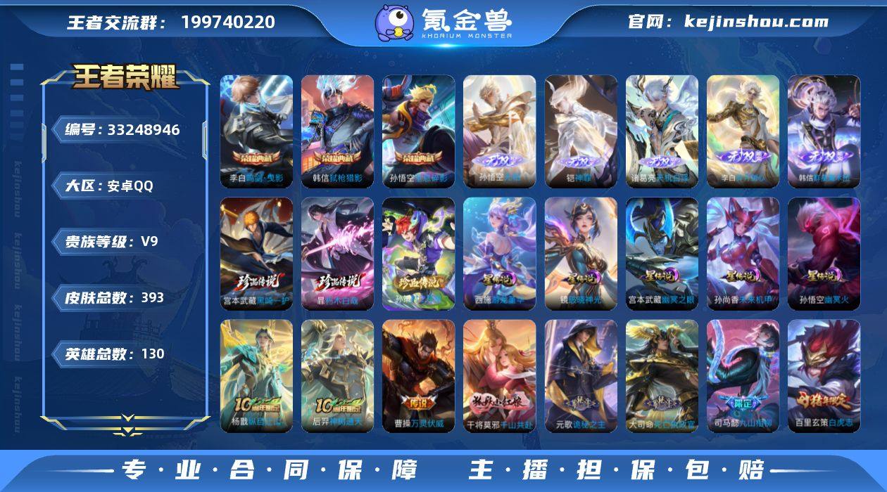 安卓Q-V9-最强王者段位-130英雄-393皮肤-3典藏皮肤-1典藏英雄-6无双-3珍品传说-38传说-114史诗【英雄全皮】:嬴政全皮,元歌全皮,孙权全皮,猪八戒全皮,大司命全皮,敖隐全皮,司空震全皮,空空儿全皮【荣耀典藏】:武则天英雄,孙悟空全息碎影,李白鸣剑曳影,韩信弑枪猎影【无双皮肤】:李信问心剑,孙悟空无相,铠神罪,诸葛亮天机白泽,韩信群星魔术团,李白碎月剑心【珍品传说】:宫本武藏黑崎一护,暃朽木白哉,孙策时之奇旅【传说皮肤】:关羽神骥镇沧海,狄仁杰神骥赴朔漠,杨戬纵目迁山,后羿神树通天,曹操万灵伏威,干将莫邪千山共赴,元歌诡秘之主,大司命死亡执政官,司马懿九山相柳,司空震愿照山河定,澜愿照九州拓,嬴政玄雷天君,桑启鸣野蒿,典韦战鼓燎原,赵云乘龙铭钟鼎,马超琥珀纪元,诸葛亮鹤羽星尊,夏洛特浮生妄,干将莫邪画中仙,花木兰燃星之曲,孙悟空齐天大圣,马可波罗深海之息,裴擒虎寅虎赤拳,铠绛天战甲,镜炽阳神光,虞姬启明星使,孙悟空零号赤焰,曜云鹰飞将,貂蝉猫影幻舞,干将莫邪久胜战神,达摩黄金狮子座,百里玄策白虎志,花木兰冠军飞将,后羿黄金射手座,孙尚香末日机甲,宫本武藏地狱之眼,孙悟空地狱火,武则天海洋之心【限...