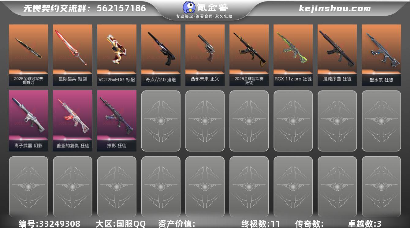 【套装】:2025全球冠军赛套装【英雄】:炼狱,维斯,暮蝶,壹决,捷风,雷兹,幽影,不死鸟,贤者,猎枭,芮娜,尚勃勒,霓虹,斯凯,盖可,钢锁【近战武器】:近战武器-2025全球冠军赛 蝴蝶刀,近战武器-碎心裂刃,近战武器-魔术火花,近战武器-星际猎兵 短剑,近战武器-魔术火花【狂徒】:狂徒-2025全球冠军赛,狂徒-混沌序曲,狂徒-塑水宗,狂徒-RGX 11z Pro,狂徒-掠影,狂徒-盖亚的复仇【幻影】:幻影-离子武器【骇灵】:骇灵-无限竞技【VCT手枪】:标配-VCT25 x EDG【正义】:正义-西部未来【鬼魅】:鬼魅-奇点//2.0【卡面】:Clutch 卡面,无畏契约GO!第一卷:芮娜 卡面,无畏契约GO!第一卷:零 卡面,《双城之战》金克丝 卡面,别冒尖 卡面,代号红色 卡面,新兵报到 卡面,V契约 卡面,无畏契约 卡面【喷漆】:霓光四射 喷漆,买装还是存钱 喷漆,关门放狗 喷漆,无畏契约GO!第一卷:芮娜 喷漆,无畏契约GO!第一卷:贤者 喷漆,暴走萝莉 喷漆,飓刃涂鸦 喷漆 ,胜利属于无畏契约 喷漆,GLHF 喷漆,无畏契约 喷漆【挂饰】:无畏契约GO!第一卷 零 挂饰,Z世代特饮 挂饰,VCT x EDG 挂饰,天外飞客 挂饰,无畏契约 纪念币 挂饰