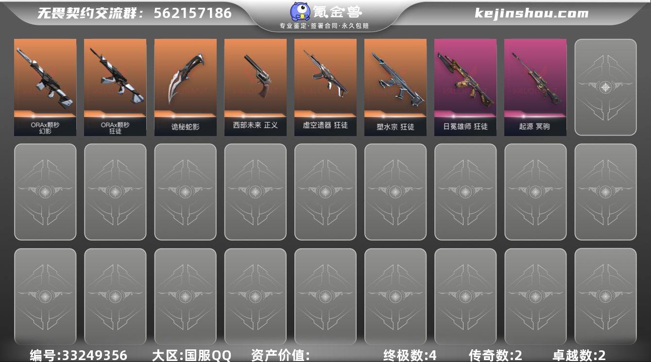 【英雄】:幻棱,炼狱,维斯,暮蝶,钛狐,壹决,铁臂,捷风,雷兹,幽影,不死鸟,贤者,猎枭,蝰蛇,零,芮娜,奇乐,尚勃勒,霓虹,斯凯,夜露,星礈,K/O,海神,盖可,黑梦,钢锁【近战武器】:近战武器-诡秘蛇影 军刀【狂徒】:狂徒-塑水宗,狂徒-虚空遗器,狂徒-ORA x 颗秒,狂徒-日冕雄师,狂徒-诡秘蛇影【幻影】:幻影-ORA x 颗秒,幻影-末日之翼【戍卫】:戍卫-折光棱晶【冥驹】:冥驹-起源【飞将】:飞将-末日之翼【莽侠】:莽侠-诡秘蛇影【奥丁】:奥丁-末日之翼【判官】:判官-诡秘蛇影【蜂刺】:蜂刺-折光棱晶【标配】:标配-折光棱晶【正义】:正义-西部未来【鬼魅】:鬼魅-诡秘蛇影,鬼魅-宿怨【短炮】:短炮-末日之翼【卡面】:精灵大战 卡面,南瓜盛典 卡面,梦幻奶茶 卡面,无畏契约:尚勃勒 卡面,无畏契约GO!第一卷:芮娜 卡面,无畏契约GO!第一卷:零 卡面,代号红色 卡面,新兵报到 卡面,V契约 卡面,无畏契约 卡面【喷漆】:控场勿近 喷漆,尚勃勒 喷漆,分身有术 喷漆,致命优雅 喷漆,买装还是存钱 喷漆,胜利属于无畏契约 喷漆,GLHF 喷漆,无畏契约 喷漆【挂饰】:伞绳 挂饰,第九季//第三幕 纪念币 挂饰,有事联系 挂饰,天外飞客 挂饰,无畏...