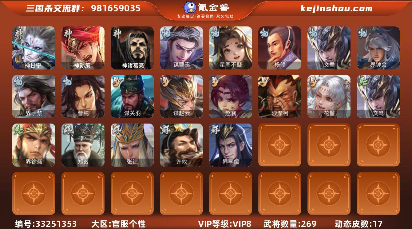 标题:S37126 【支持分期】 VIP等级:VIP8 官阶:骠骑将军 史诗武将数量:21 动态皮肤数量:17 史诗宝珠数量:6 将魂数量:1236 雁翎数量:7231 心愿积分:5608 史诗武将(魏国):文鸯,谋曹丕,界钟会,星周不疑,杨修,界于禁,程昱,曹纯 史诗武将(蜀国):谋关羽,谋赵云,沙摩柯,花鬟,赵襄 史诗武将(吴国):界徐盛,文鸯 史诗武将(群雄):许攸,郑玄,界李儒,张让,兀突骨 史诗武将(神将):神甘宁,神孙策