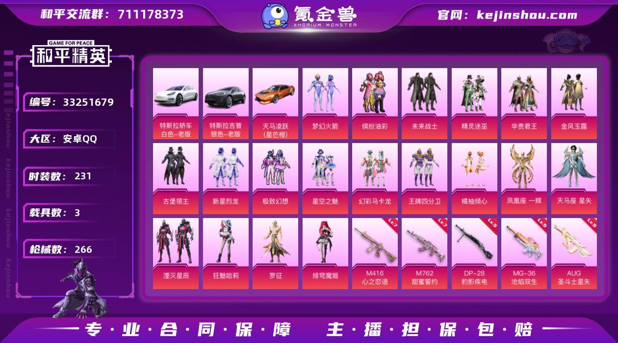 安卓 手Q-19粉装-8特效枪-3载具-4粉色飞行器-98860热力值-10王牌印记-231套装-266枪皮 【热门品类】:粉装-梦幻火箭,粉装-缤纷油彩,套装-潮萌小黄鸭,套装-暗影哥特,套装-浪漫波比 【粉色套装】:粉装-未来战士,粉装-精灵迷巫,粉装-梦幻火箭,粉装-华贵君王,粉装-金风玉露,粉装-缤纷油彩,粉装-古堡领主,粉装-新星烈龙,粉装-极致幻想,粉装-星空之魅,粉装-幻彩马卡龙,粉装-王牌四分卫,粉装-橘柚倾心,角色-凤凰座 一辉,角色-天马座 星矢,粉装-湮灭星辰,角色-狂魅哈莉,角色-罗征,角色-绯穹魔姬 【粉色枪皮等级】:M416-心之恋语(七级),AUG-圣斗士星矢(五级),M762-甜蜜誓约(七级),汤姆逊-热量炸弹(五级),Kar98K-巳巳如意(五级),Mk14-甜梦熊击(五级),DP-28-豹影疾电(五级),MG-36-沧焰双生(五级) 【粉色载具】:特斯拉Model 3(珍珠白),特斯拉Model X(冷光银),天马凌跃(星芒橙) 【粉色枪皮】:M416-心之恋语,AUG-圣斗士星矢,M762-甜蜜誓约,汤姆逊-热量炸弹,Kar98K-巳巳如意,Mk14-甜梦熊击,DP-28-豹影疾电,MG-36-沧焰双生 【粉色飞行器】:炫彩糖果飞行器,梦幻火箭飞行器,炫紫旋律飞行器,心之恋语飞行翼 【粉色降落伞】:春暖花开降落伞...