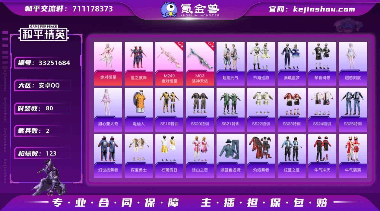 2神装2粉装6特效枪2载具39385热力值 【红色神装等级】:灵驹仙姬-云歌(二级),暮色玫影-艾丽娅(一级) 【红色角色神装】:灵驹仙姬-云歌,暮色玫影-艾丽娅 【热门品类】:套装-龟仙人 【粉色套装】:角色-绝对恒星,粉装-星之彼岸 【粉色枪皮等级】:AKM-暮色玫影(三级),AKS-74U-森灵之息(五级),Mk14-福马献瑞(五级),AA12-G-萌骑幻想(一级),M249-绝对恒星(四级),MG3-洛神天依(三级) 【粉色载具】:暮色幽蹄,九霄玄鹿 【粉色枪皮】:AKM-暮色玫影,AKS-74U-森灵之息,Mk14-福马献瑞,AA12-G-萌骑幻想,M249-绝对恒星,MG3-洛神天依 【粉色飞行器】:绝对恒星飞行器,香车宝马飞行器,暮色之舞飞行器,云梦轻舟飞行器 【粉色降落伞】:绝对恒星降落伞,星之彼岸降落伞,洛神天依降落伞,天星战神降落伞,暮色玫影降落伞,辉云木星降落伞,灵驹仙姬降落伞 【稀有套装】:套装-龟仙人,套装-超能元气,角色-超感刻度,角色-甜心蒙太奇,套装-雪国风尚,玩偶服-小熊虫,套装-马上有钱,套装-迅捷龙虾,套装-书海巡游,套装-画境星梦,套装-琴音绮想,套装-粉彩缠枝,套装-雨过天青,套装-红釉青花,角色-幽雨猫猫,角色-暖阳柴柴 【稀有枪皮】:AKM-破晓战魂,AKM-龙的传人,M...