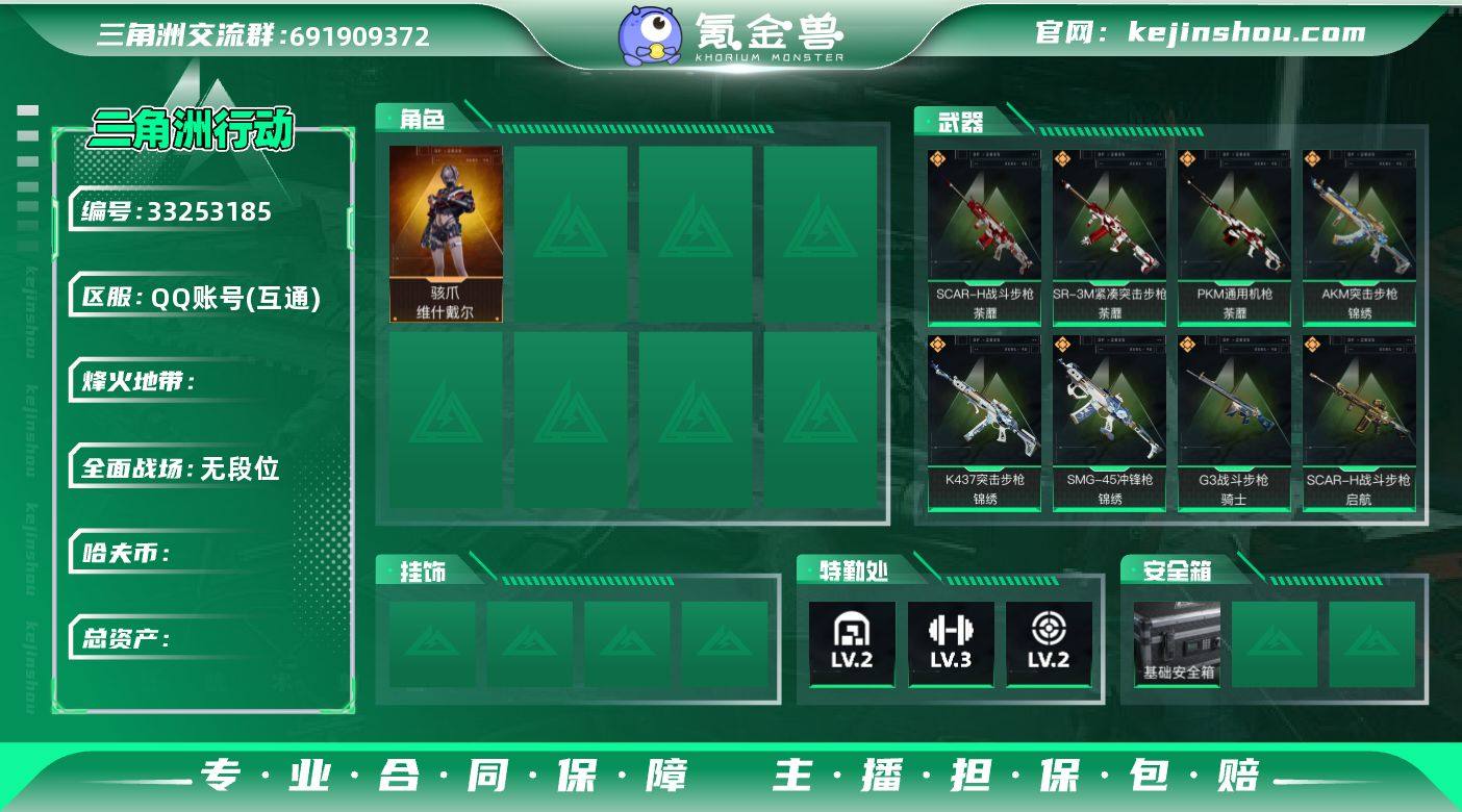 【总资产14.15M 哈弗币43.3万 干员外观1个 烽火35级 铂金】仓库14M 现金433176 黑鹰 骇爪-维什戴尔 M4A1突击步枪-阿米娅,AKM突击步枪-锦绣,SCAR-H战斗步枪-启航,SCAR-H战斗步枪-荼蘼,G3战斗步枪-骑士,K437突击步枪-锦绣,SMG-45冲锋枪-锦绣,SR-3M紧凑突击步枪-荼蘼,PKM通用机枪-荼蘼,R93狙击步枪-维什戴尔 德 挂凌工作青 df21-11,编号:WPENE64