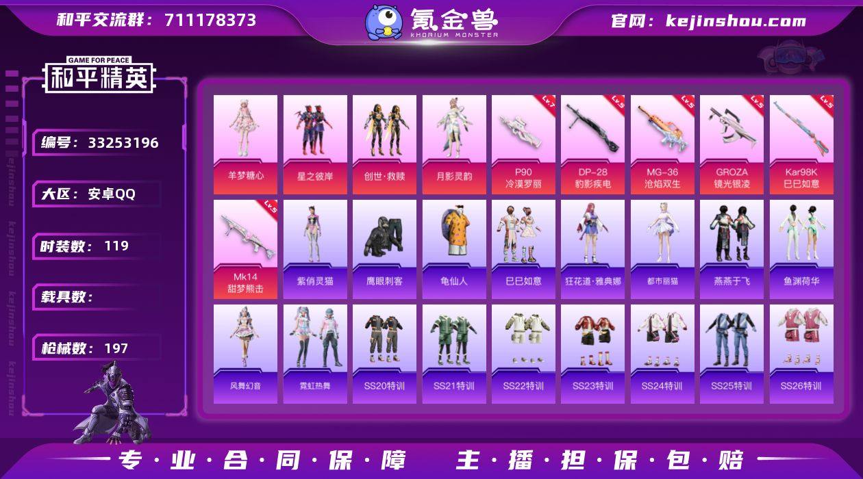 安卓 手Q-4粉装-9特效枪-0载具-5粉色飞行器-54382热力值-8王牌印记-119套装-197枪皮 【热门品类】:套装-龟仙人 【粉色套装】:粉装-星之彼岸,套装-创世·救赎,角色-月影灵韵,角色-羊梦糖心 【粉色枪皮等级】:GROZA-镜光银凌(五级),AKS-74U-森灵之息(五级),P90-冷漠罗丽(七级),Kar98K-巳巳如意(五级),Mk14-甜梦熊击(五级),Mk14-福马献瑞(五级),AA12-G-萌骑幻想(三级),DP-28-豹影疾电(五级),MG-36-沧焰双生(五级) 【粉色枪皮】:GROZA-镜光银凌,AKS-74U-森灵之息,P90-冷漠罗丽,Kar98K-巳巳如意,Mk14-甜梦熊击,Mk14-福马献瑞,AA12-G-萌骑幻想,DP-28-豹影疾电,MG-36-沧焰双生 【粉色飞行器】:炫彩糖果飞行器,祥瑞锦鲤飞行器,繁龙极客飞行器,墨金战记飞行器,极意拳锋飞行器 【粉色降落伞】:星之彼岸降落伞,炫光之旅降落伞,莲影清波降落伞,圣堂之誓降落伞,精灵梦叶罗丽降落伞,月影灵韵降落伞,动力核心降落伞,星穹咏叹调降落伞,异瞳寒姬降落伞,炫彩糖果降落伞 【稀有套装】:套装-龟仙人,套装-巳巳如意,套装-雪国风尚,套装-炫彩糖果,套装-马上有钱,套装-迅捷龙虾,套装-遗迹猎人,角色-狂花道·雅典娜,角色-都市丽猫,套装-燕燕于飞,套装-...