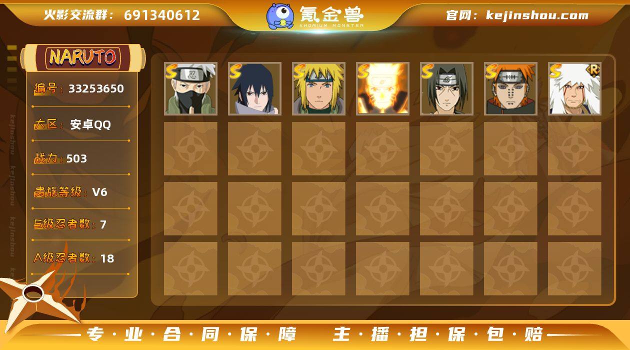 27122|【可实名】可二次 503w战力 v6 安卓QQ 3325区 S忍者数:7 A忍者数:18 时装7安卓QQ 3325区 S忍者数:7 A忍者数:18 忍者:旗木卡卡西「须佐能乎」,宇智波佐助「永恒万花筒」,漩涡鸣人「九喇嘛连结」,自来也「舞之豪杰」,宇智波鼬「须佐能乎」,佩恩「天道」,波风水门,宇智波带土「漂泊浪客」,宇智波泉奈,蝎「绯流琥」,旗木卡卡西「幻之真容」,日向雏田「最终章」,漩涡博人「桃式显现」,长十郎「六代目水影」,迪达拉「秽土转生」,宇智波佐助「万花筒写轮眼」,飞段「死司凭血」,飞段,迪达拉,我爱罗「疾风传」,蝎,干柿鬼鲛,宇智波鼬,猿飞阿斯玛,迈特凯,野原琳「漂泊浪客」,佐井「最终章」,御手洗红豆「新春限定」,佩恩「饿鬼道」,奈良鹿丸「最终章」,佩恩「人间道」,白「秽土转生」,天天「峨眉宗师」,君麻吕「漂泊浪客」,枫「新佩恩六道」,萨姆伊「新春限定」,鬼灯满月「忍刀七人众」,宇智波鼬「红夜之刃」,贰「火之意志继承者」,羽高「新佩恩六道」,李洛克「截拳宗师」,紫阳花,春野樱「忍者少女」,漩涡玖辛奈「新春限定」,夕日红「和服」,惠比寿,卯月夕颜,木叶丸「疾风传」,鬼灯水月,手鞠「疾风传」,油女志乃「疾风传」,重吾,天天「疾风传」,秋道丁次「疾风传」,李洛克「疾风传...