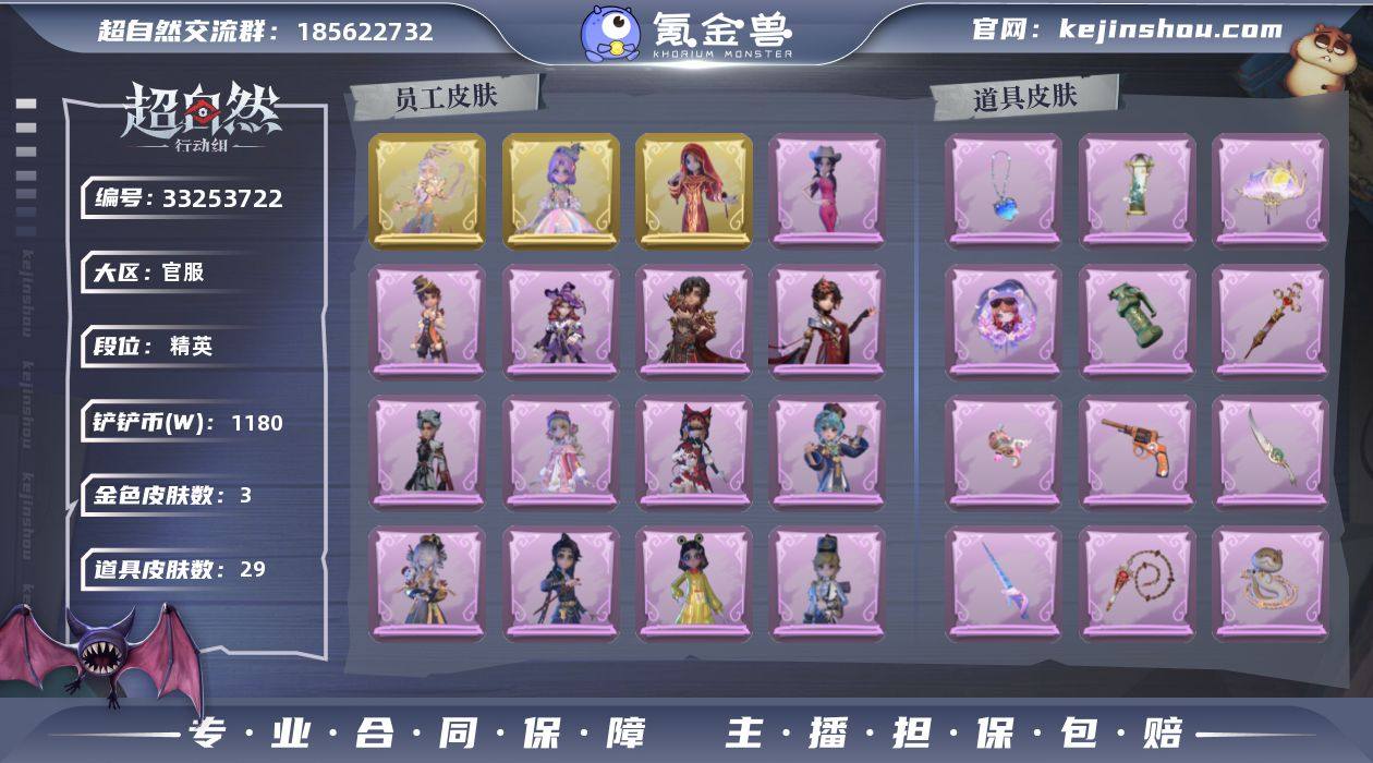 小黄-遗失的童话,巫铃儿-镜花辞,逍遥-莲华渡,兰-千夜星谕,艾伦-黎明猎手,莉莉-除妖小师妹,莉莉-莓果陷阱,薇薇安-仙锋小姐,逍遥-绣春逍影,阿念-王子与骑士,阿念-迷途僵宝,阿念-庆宴绮愿,零-搬开山,爱丽丝-丝缕哀歌,爱丽丝-甜梦派对,爱丽丝-耀眼的你,小黄-呱呱雨衣,刺刀-碧络琅环,桃木剑-最后的独角兽,长鞭-小狗蛇点点鞭,长鞭-缚誓之锁,传送按钮-昆仑镜,传送按钮-逆时审判,传送按钮-浮生一梦,摸金符-祝祷词,摸金符-紫霄,摸金符-海洋之心,腰包-月下莲台,腰包-红运福虎,短管猎枪-星光的裁决,专业手电-云端梦想计划,专业手电-花束般的告白,葫芦-伏妖塔,黄牛能量饮料-青玉抱丹,额外的背包-飞花令,夜视仪-金丝眼镜,音响-happy猫,音响-鸣沙鼓,音响-冬夜暖忆,转轮手枪-新星时代,电击枪-甜蜜泡泡枪,急救包-蔷薇物语,急救包-末章心跳,折扇-露露扇,折扇-赴此良宵,闪光弹-金戈玄铜,DL摇,小雨摇,心跳摇,舞台中心,伤心摇,卡点舞,鹏友摇,luvaboy,鸳鸯戏,七仔摇,金城舞,企鹅舞,新年摇,律动迪斯科,抬手,KT猫摇,举牌,要糖,带你逃跑吧,蝴蝶步,豪华定制烟花,萨卡班甲鱼头套,小狗蛇点点头套,暗夜小恶魔,天使的呼唤,毛球夹子,云梦之星,蝶恋花,绒团小狐狸,梵音莲华,子夜证词,白鼬趴趴,炽天使的余烬,潮...