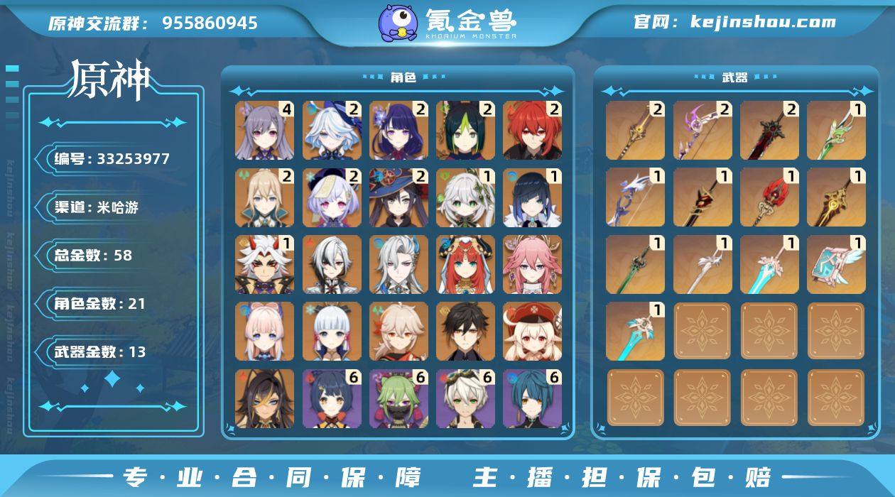 58黄! 雷国!2命雷电将军,2命芙宁娜!1+1荒泷一斗,1+1夜兰,1命纳西妲!枫原万叶,神里绫华,可莉,钟离,珊瑚宫心海,八重神子,妮露,龙王!仆人!2精武器: 狼的末路,飞雷之弦振,赤沙之杖 1精武器: 天空之卷,天空之傲,风鹰剑,天空之刃,磐岩结绿,护摩之杖,裁叶萃光,苇海信标!冒险等级: 60