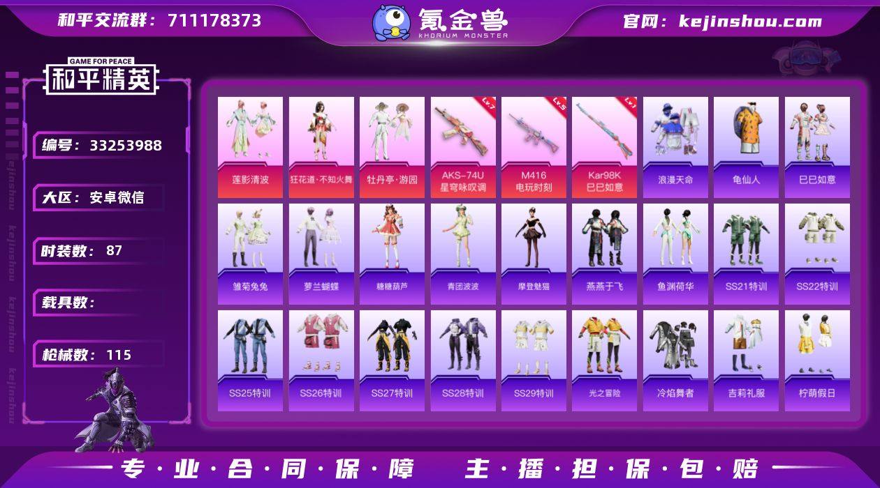 W16050 可立即换绑无需挂单养号 安卓 微信-3粉装-3特效枪-0载具-3粉色飞行器-34372热力值-3王牌印记-87套装-115枪皮 【热门品类】:套装-浪漫天命,套装-龟仙人 【粉色套装】:粉装-莲影清波,角色-狂花道·不知火舞,粉装-牡丹亭·游园 【粉色枪皮等级】:M416-电玩时刻(五级),AKS-74U-星穹咏叹调(七级),Kar98K-巳巳如意(一级) 【粉色枪皮】:M416-电玩时刻,AKS-74U-星穹咏叹调,Kar98K-巳巳如意 【粉色飞行器】:炫彩糖果飞行器,脆鲨七海飞行器,墨金战记飞行器 【粉色降落伞】:蜜语绒猫降落伞,精灵梦叶罗丽降落伞,千金淑猫降落伞,炫彩糖果降落伞,霁蓝缠春降落伞 【稀有套装】:套装-龟仙人,套装-巳巳如意,套装-炫彩糖果,套装-雏菊兔兔,套装-萝兰蝴蝶,套装-糖糖葫芦,套装-青团波波,角色-摩登魅猫,套装-燕燕于飞,套装-鱼渊荷华 【稀有枪皮】:AUG-冰晶雪宝,AKM-破晓战魂,AKM-龙的传人,SCAR-L-炫彩节奏,SCAR-L-玉兔迎春,M416-糯团青竹,M416-红色方程式,GROZA-2B战斗服款,AUG-耀粉歌者,QBZ-未来歌姬,QBZ-洛神天依,M762-天降萌叽,AC-VAL-天降萌叽,AC-VAL-快闪甜心,蜜獾-天降萌叽,蜜獾-娇憨猪猪,UZI-啾咪啾咪,UZI-天降萌叽,UZI-娇憨猪猪,U...