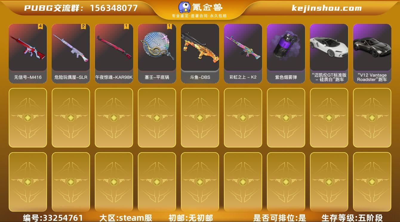 JDPX13784 生存500级可排位/9级美杜莎-BerylM762/4级无信号-M416/2级危险玩偶屋-SLR/1级午夜惊魂-KAR98K/1级烈日灼烧-S1897/1级塞壬-平底锅/迈凯伦硅质白版/阿斯顿马丁跑车/翡翠色烟雾弹/紫色烟雾弹/内马尔/双马尾/丸子头/脏辫/红面具/金面具/悲喜跟我结婚吧礼包/白熊鞋/红鞋/粉色电磁包/疯狂科学电磁背包/太阳之子电池干扰背包/艾伦格零度大厅/ 0BF93Z号 无排名, 生存等级2500, 名誉等级4, 金标数量1, 图纸1, 聚合物4563, 枪皮数量84, [成长型] 无信号 - M416[4级], [成长型] 美杜莎 - Beryl M762[9级], [成长型] 危险玩偶屋 - SLR[2级], “V12 Vantage Roadster” 跑车, “迈凯伦GT标准版 - 硅质白” 跑车