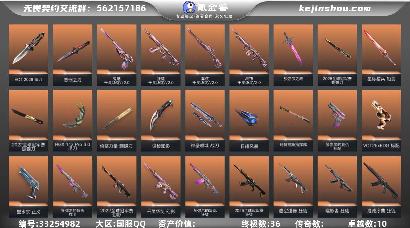 【955319】【套装】:2025全球冠军赛套装,2022全球冠军赛套装,VCT 2026 赛季套装,无畏契约季前邀请赛套装,千灵华绽//2.0套装,多弥尔的复仇套装 【英雄】:幻棱,炼狱,维斯,暮蝶,钛狐,壹决,铁臂,捷风,雷兹,幽影,不死鸟,贤者,猎枭,蝰蛇,零,芮娜,奇乐,尚勃勒,霓虹,斯凯,夜露,星礈,K/O,海神,盖可,黑梦,钢锁 【近战武器】:近战武器-2025全球冠军赛 蝴蝶刀,近战武器-2022全球冠军赛 蝴蝶刀,近战武器-碎心裂刃,近战武器-VCT 2026 篆刀,近战武器-无畏契约季前邀请赛 悲悯之刃,近战武器-流风回雪,近战武器-多弥尔之裁,近战武器-侦察力量 蝴蝶刀,近战武器-剥皮小刀,近战武器-紫金爪刀,近战武器-RGX 11z Pro//3.0 爪刀,近战武器-鬼丸国纲,近战武器-诡秘蛇影 军刀,近战武器-神圣领域 战刀,近战武器-日耀风暴 遗器,近战武器-阿特拉斯指挥部 甩棍,近战武器-星际猎兵 短剑 【狂徒】:狂徒-2025全球冠军赛,狂徒-洪荒怒焰,狂徒-混沌序曲,狂徒-塑水宗,狂徒-虚空遗器,狂徒-噬影者,狂徒-多弥尔的复仇,狂徒-千灵华绽//2.0,狂徒-掠影,狂徒-盖亚的复仇,狂徒-紫阙金琅,狂徒-离子武器//2.0,狂徒-诡秘蛇影 【幻影】:幻影-2022全球冠军赛,...