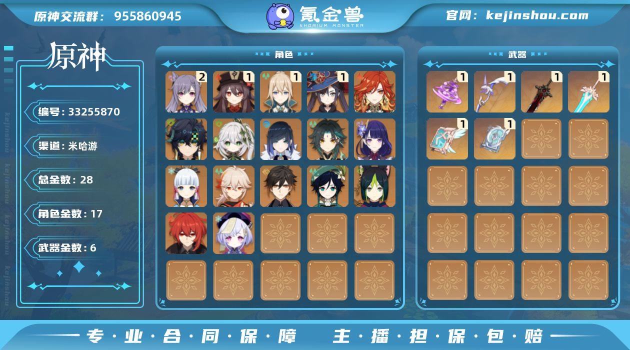 58级/28黄/女主/17个五星角色/6个五星武器 0命纳西妲,0命提纳里,0命夜兰,0命雷电将军,0命枫原万叶,0命神里绫华,0命钟离,1命胡桃,0命魈,0命温迪,2命刻晴,0命七七,1命琴,1命莫娜,0命迪卢克,0命基尼奇,0命玛薇卡,精1神乐之真意,精1四风原典,精1阿莫斯之弓,精1天空之卷,精1狼的末路,精1天空之傲