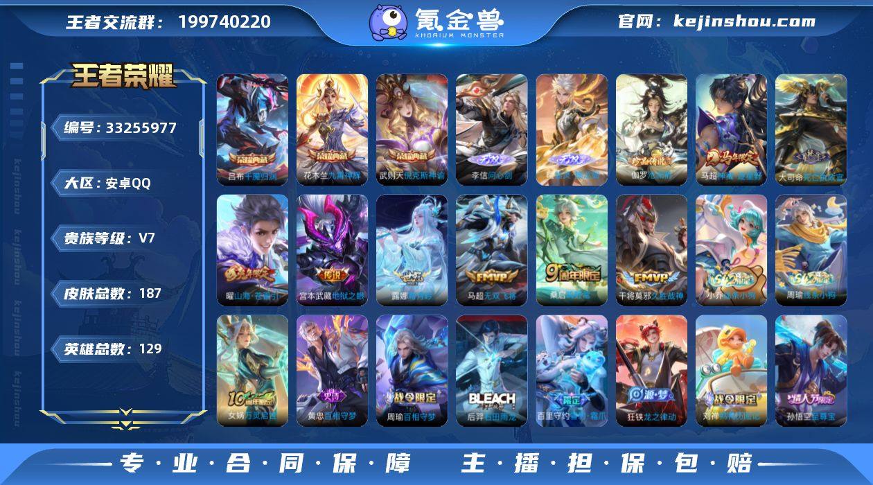 精品V7-129英雄-187皮肤-3典藏皮肤-2无双-1珍品传说-8传说-55史诗 【英雄全皮】:敖隐全皮 【荣耀典藏】:武则天倪克斯神谕,花木兰九霄神辉,吕布千魇归渊 【无双皮肤】:李信问心剑,曜器灵螭龙剑 【珍品传说】:伽罗沧流箭 【传说皮肤】:马超神骥逐星野,大司命死亡执政官,桑启鸣野蒿,露娜霜月吟,曜山海苍雷引,马超无双飞将,干将莫邪久胜战神,宫本武藏地狱之眼 【限定皮肤】:蔡文姬夏日便利店,虞姬夏日便利店,姜子牙天穹之誓,杨戬破阵退雄兵,狄仁杰阴阳师,赵云皇家上将,嬴政优雅恋人,元歌云间偶戏,元歌无心,狄仁杰魔术师,达摩沙漠行僧,项羽海滩派对,韩信飞衡,孙悟空至尊宝,孙悟空孙行者,李元芳云中旅人,干将莫邪胡桃夹子,鬼谷子五谷丰年,沈梦溪大漠名商,裴擒虎擒涛扼浪,曜山海苍雷引,西施玲珑珍味,蒙犽狂想玩偶喵,鲁班大师探海日志,桑启海盐诗旅,张良古海寻踪,高渐离燃音魔法,妲己灵卜魔法,鬼谷子天穹祈灯,伽罗琥珀纪元,沈梦溪龙舞盛年,鲁班七号蔬乡物语,李元芳蔬乡物语,刘邦剑破天穹,周瑜熔金海岸 【年限皮肤】:韩信飞衡,曜山海苍雷引 【赛季限定】:达摩沙漠行僧,沈梦溪大漠名商,李元芳云中旅人,桑启海盐诗旅,裴擒虎擒...