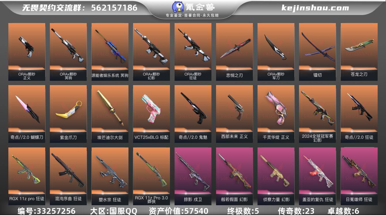 段位: 铂金 亮点皮肤: 幻影-2024全球冠军赛 近战武器皮肤: 紫金爪刀-紫阙金琅//2.0,埃芒迪尔大剑-日冕雄师,蝴蝶刀-奇点//2.0,镭切-创·纪元,苍龙之刃,ORAx颗秒 军刀,无畏契约季前邀请赛 悲悯之刃 步枪皮肤: 狂徒-紫阙金琅,狂徒-盖亚的复仇,幻影-侦察力量,狂徒-塑水宗,幻影-般若假面,狂徒-日冕雄师,狂徒-混沌序曲,狂徒-奇点//2.0,戍卫-掠影,狂徒-RGX 11z pro,幻影-ORAx颗秒,狂徒-ORAx颗秒 佩枪皮肤: 正义-千灵华绽,鬼魅-奇点//2.0,标配-VCT25xBLG,正义-西部未来,正义-ORAx颗秒 狙击枪皮肤: 冥驹-源能者娱乐系统,莽侠-RGX 11z Pro 3.0,冥驹-ORAx颗秒 亮点: 【充值总皮肤】: RGX 11z Pro 狂徒, 无畏契约季前邀请赛 悲悯之刃, RGX 11z Pro//3.0 莽侠, 埃芒迪尔大剑, ORA x 颗秒 军刀, ORA x 颗秒 幻影, ORA x 颗秒 狂徒, ORA x 颗秒 冥驹, ORA x 颗秒 正义, 西部未来 正义, 5周年//公测重制版 苍龙之刃, 日冕雄师 狂徒, 紫金爪刀, 掠影 戍卫, 镭切, VCT25 x BLG 标配, 盖亚的复仇 狂徒, 源能者娱乐系统 冥驹, 侦察力量 幻影, 塑水宗 狂徒, 奇点//2.0 狂徒, 奇点//2.0 蝴蝶刀, 奇点//2.0 鬼魅, 般若假面 幻影, 千灵华绽 正义, 紫阙金琅 狂徒, 2024全球冠军赛 幻影, 混沌序曲 狂徒