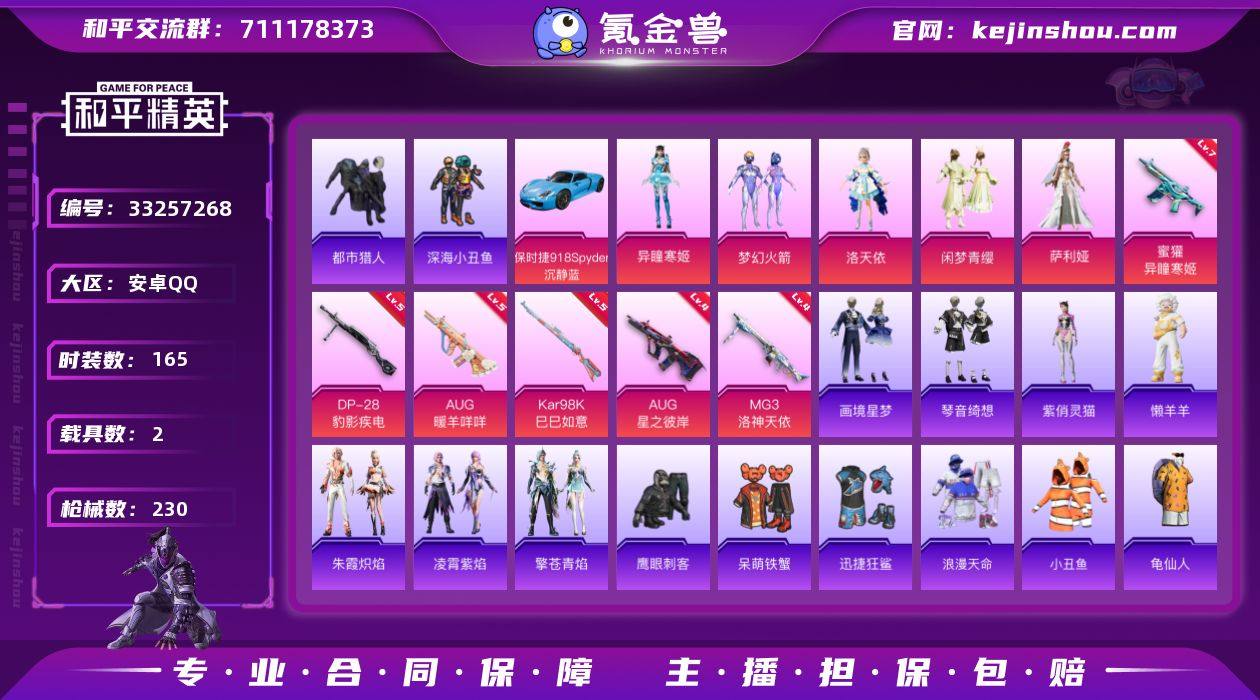 安卓 手Q-7粉装-10特效枪-2载具-4粉色飞行器-72376热力值-5王牌印记-165套装-230枪皮 【热门品类】:粉装-梦幻火箭,套装-浪漫天命,套装-都市猎人,套装-深海小丑鱼,套装-小丑鱼,套装-龟仙人,套装-暗影哥特,套装-粉红小猪,角色-Mark.06 【粉色套装】:粉装-梦幻火箭,角色-洛天依,粉装-闲梦青缨,角色-萨利娅,角色-异瞳寒姬,角色-烬夜之誓,角色-鸢尾珑雾 【粉色枪皮等级】:M416-天马神君(三级),AUG-星之彼岸(四级),AUG-暖羊咩咩(五级),蜜獾-异瞳寒姬(七级),ACE32-萌骑漫游(二级),AKS-74U-森灵之息(五级),Kar98K-巳巳如意(五级),Mk14-福马献瑞(五级),DP-28-豹影疾电(五级),MG3-洛神天依(四级) 【粉色载具】:保时捷918 Spyder(沉静蓝),霜月冰狼 【粉色枪皮】:M416-天马神君,AUG-星之彼岸,AUG-暖羊咩咩,蜜獾-异瞳寒姬,ACE32-萌骑漫游,AKS-74U-森灵之息,Kar98K-巳巳如意,Mk14-福马献瑞,DP-28-豹影疾电,MG3-洛神天依 【粉色飞行器】:梦幻火箭飞行器,云梦轻舟飞行器,冰狼掠影飞行器 【粉色降落伞】:春暖花开降落伞,梦幻火箭降落伞,星之彼岸降落伞,洛神天依降落伞,垂柳戏鸭降落伞,未来歌姬降落伞,闲梦青缨降落伞,炫光之旅降落伞,千金...