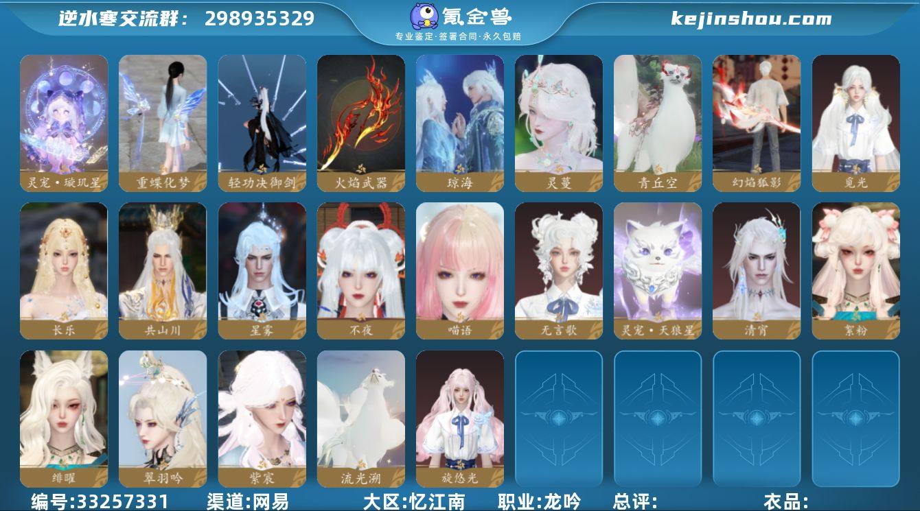 【已用天赏石33-转盘外观2】【4.11可换绑】战力值:2006876 总评:2006876 角色等级:89 衣品值: 325680 国色值: 104120 已用天赏石:33 天霓染数量:3 【网易手机账号】 【有换绑冷却】 【龙吟】 【女】 【7级】 【卧看千山】 【互通】 转盘外观2 副本外观2 天赏外观19 天赏祥瑞2 天赏灵宠2 武器环身2 转盘外观:旋悠光,追光; 副本外观:白夜拂雪,紫宿宸极; 天赏外观:桃雪浪,清宵,不夜,觅光,喵语,无言歌,翠羽吟,长乐,紫宸,共山川,星雾,灵蔓,绯曜,琼海,絮粉,火焰武器,幻焰狐影,轻功诀御剑,重蝶化梦; 天赏祥瑞:青丘空,流光溯; 天赏灵宠:灵宠·璇玑星,灵宠·天狼星; 武器环身:银甲霜锋,南枝已谢;